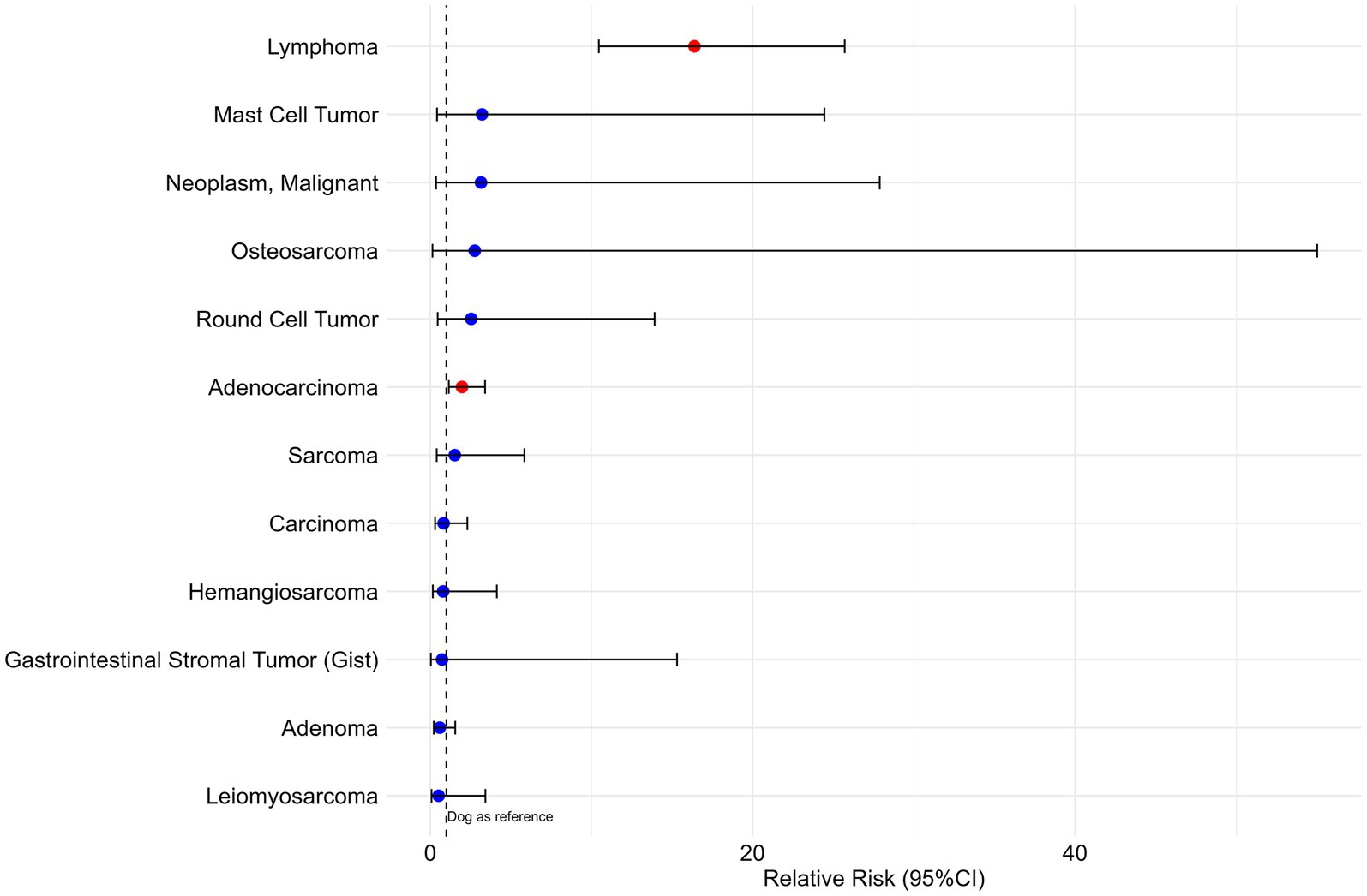 Figure 5. Relative risk and corresponding 95% confidence interval (95%CI) for different morphologies of digestive tumors in cats versus dogs.