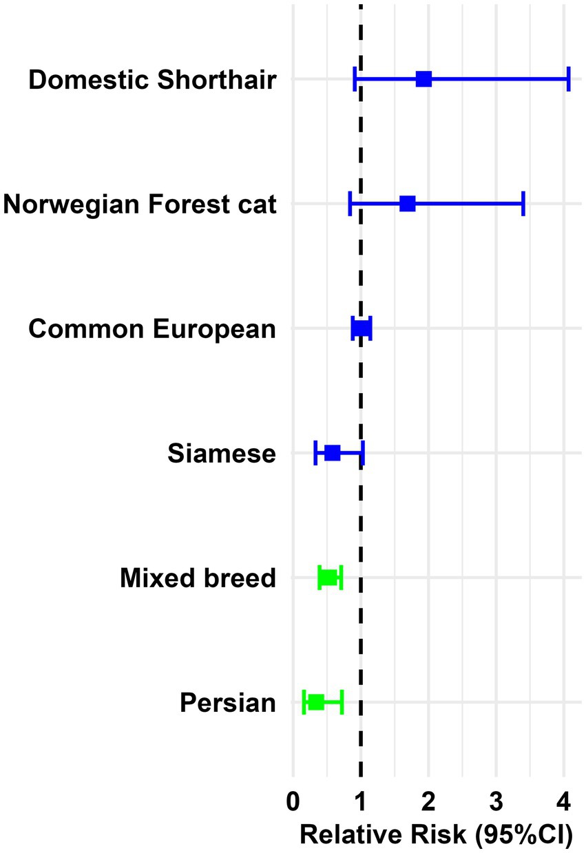 Figure 7. Feline breed-specific relative risk for digestive tract tumors (95% Confidence Intervals and n > 5). Color red indicates breeds presenting significantly increased risk; blue denotes no significant difference compared to the reference group; and green represents breeds with significantly decreased risk.