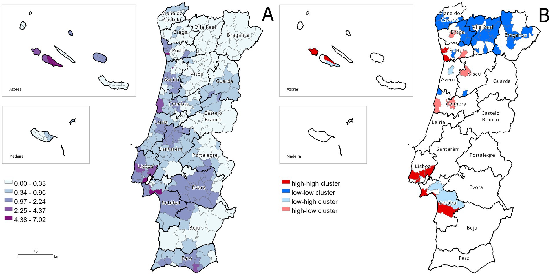 Figure 8B shows the results of LISA cluster map. The highest ratios were concentrated in the municipalities on the south and north coasts of the country, specifically in the highly urbanized metropolitan areas of Porto and Lisbon, where several high-high clusters were identified. Similar high-high clusters were also observed in the Azores islands. Considerable rates were also detected in the districts of Santarém and Setúbal. In contrast, lower ratios were mainly located in inner regions of the country, namely in more remote and inland municipalities located in the districts of Viana do Castelo, Braga, Vila Real, Viseu, and Bragança, which formed a large low-low cluster.