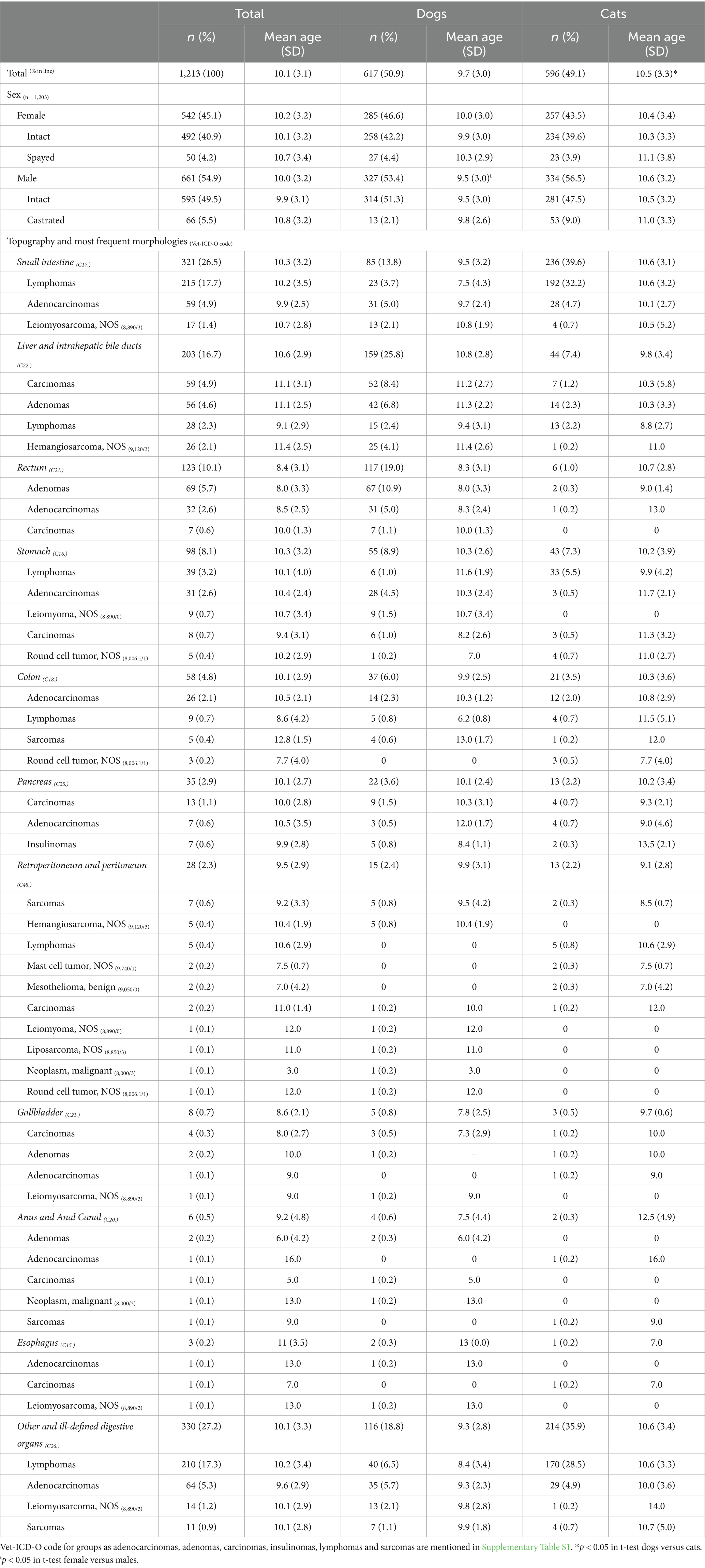 Results and discussion: A total of 1,213 cases were included: 617 dogs (50.9%) and 596 cats (49.1%), with a higher proportion of males (54.9%) than females (45.1%). The most affected organs overall were the small intestine (26.5%) and liver/intrahepatic bile ducts (16.7%). In dogs, tumors were mainly located in the liver and bile ducts (25.8%), rectum (19.0%), small intestine (13.8%), and stomach (8.9%). In cats, the small intestine was the primary site (39.6%), followed by liver/bile ducts (7.4%), stomach (7.3%), and colon (3.5%). Lymphoma was the most common tumor type in both species (42.2%), followed by adenocarcinoma (19.0%). Among dogs, mixed breeds, Labrador Retrievers, German Shepherds, and French Bulldogs were most affected. In cats, Common European, mixed-breed, and Norwegian Forest cats predominated. The incidence rate (IR) of digestive tumors was 3.5 times higher in cats than dogs. Male cats had a 1.5 times higher IR than females. Cats also had 16 times higher risk for GI lymphoma and twice the risk for adenocarcinoma compared to dogs. Certain dog breeds, including West Highland White Terrier, Siberian Husky, and Golden Retriever, showed higher tumor incidence. Spatial analysis revealed concentration in urbanized areas, particularly around Porto and Lisbon. Conclusion: These findings highlight notable species-specific differences in digestive tract tumors, suggesting distinct genetic predispositions and possible environmental influences.
