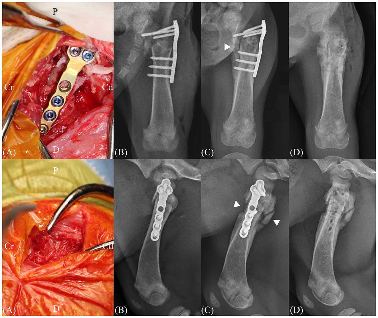 Figure 2. Intraoperative images and postoperative radiographs. (A) A tibial plateau leveling osteotomy (TPLO) plate was placed over the supratrochanteric region and secured using locking screws. (B) Immediate postoperative radiography images after subtrochanteric fracture repair. (C) Radiographs obtained 16 days postoperatively demonstrate bridging callus formation on three out of four cortices (arrowhead). (D) Immediate postoperative radiography images after implant removal. Cr, cranial; Cd, caudal; D, distal; P, proximal.
