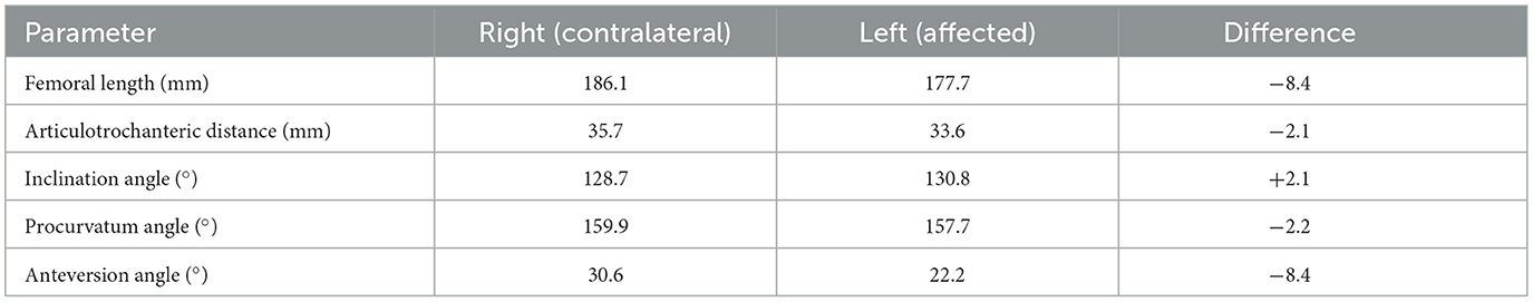 In addition to femoral length, morphometric evaluation of femoral geometry was conducted using previously described radiographic landmarks (7), including the articulotrochanteric distance (ATD), and inclination angle. At the final follow-up, the ATD was measured as 35.7 mm on the right and 33.6 mm on the left, while the inclination angle was 128.7° on the right and 130.8° on the left. These findings demonstrated minimal side-to-side differences, indication no clinically relevant femoral deformities associated with the surgical intervention.