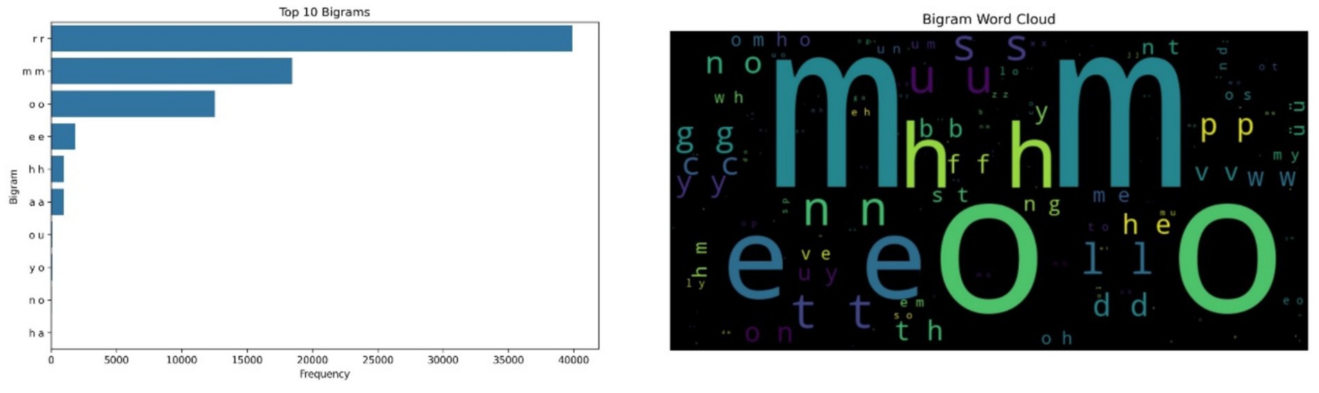 The bigram “rr” emerged as the most frequently occurring symbolic unit, appearing approximately 40,000 times, followed by “mm” and “oo.” These patterns are not interpreted linguistically but rather viewed as symbolic encodings of recurring acoustic shapes produced during vocalizations. The regularity of these bigrams, especially during prolonged vocal episodes, suggests that cows may exhibit rhythmic, repeated vocal behaviors in certain emotional contexts, particularly under emotional distress. Figure 1 illustrates the bigram frequency analysis and the corresponding word cloud.