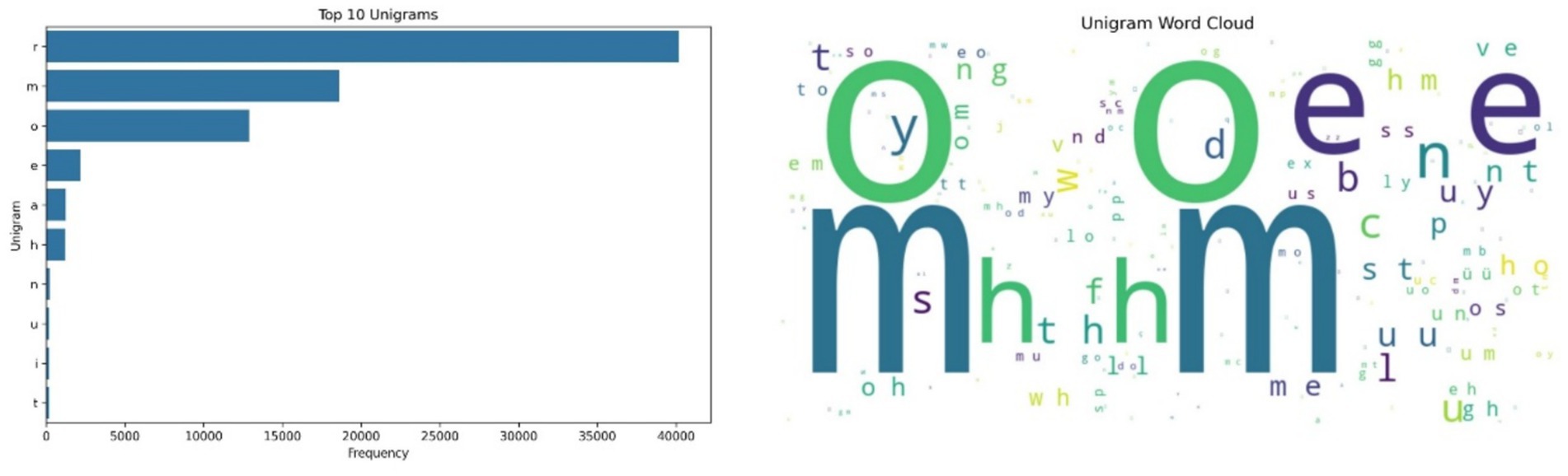 Figure 2. Left side – Unigram Frequency Distribution, showing ‘r’, ‘m’, and ‘o’ as the most frequent characters, indicating consistent symbolic encoding of common vocal elements; Right side – Word Cloud of unigram frequencies, highlighting dominant vocal elements in symbolic form.