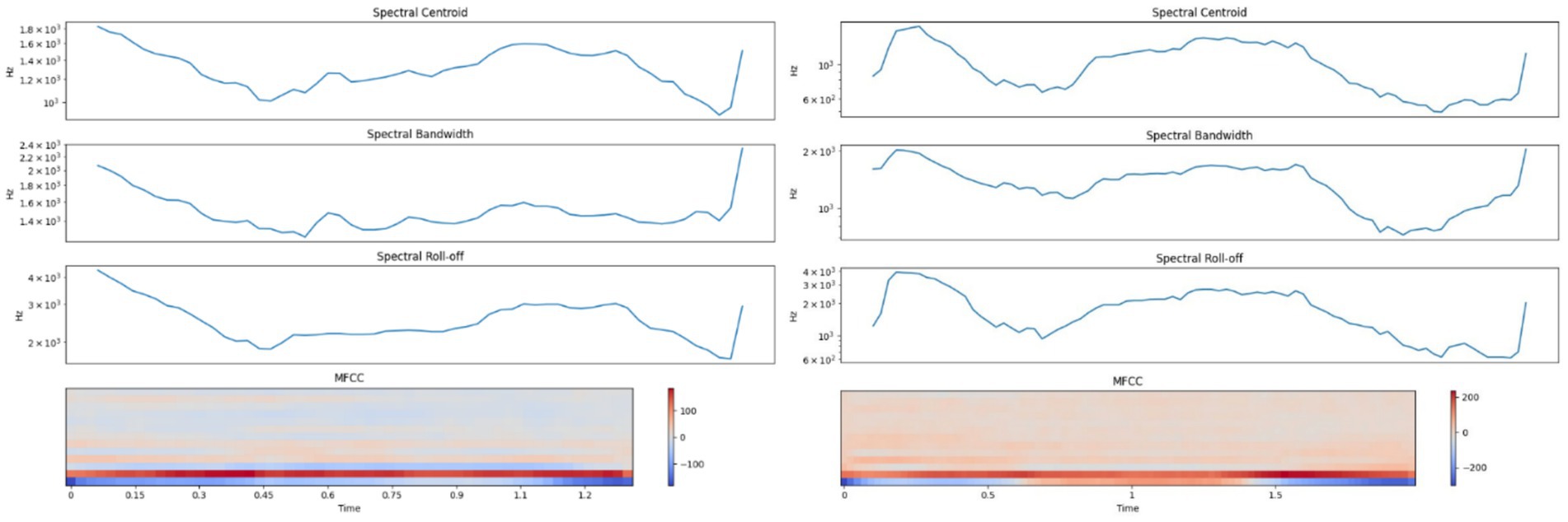 Graphs comparing spectral features for audio analysis. Six plots show spectral centroid, spectral bandwidth, and spectral roll-off in Hertz over time, with noticeable variations. Two MFCC spectrograms exhibit frequency patterns over time with color gradients.