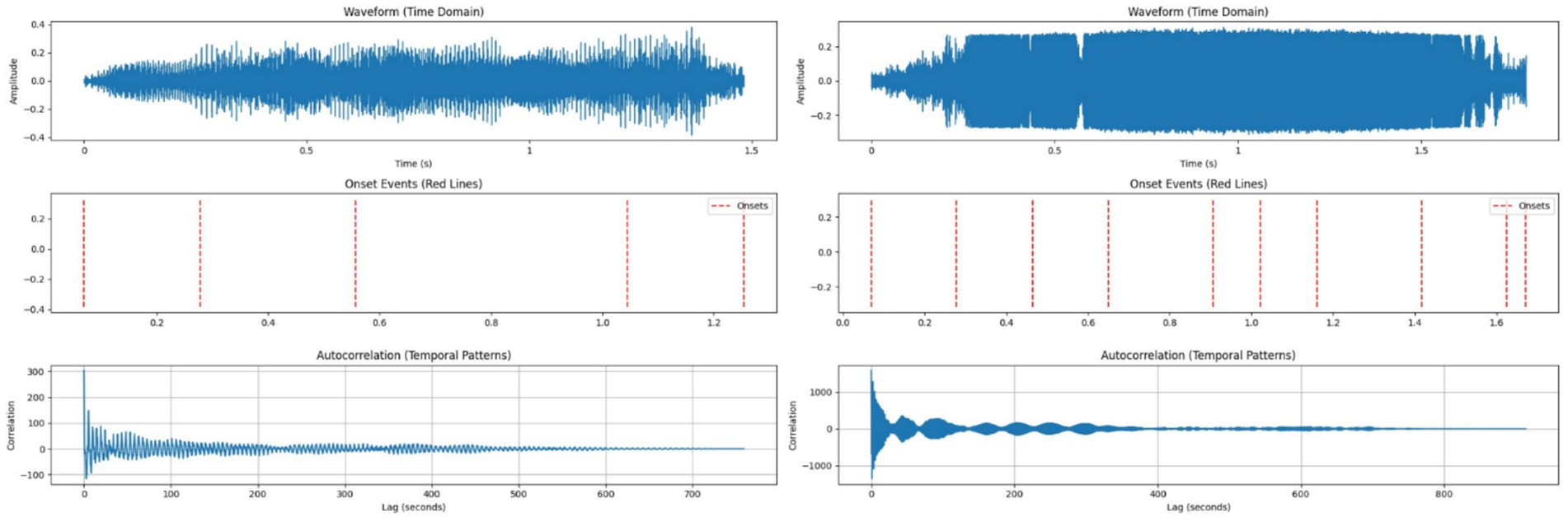 The image contains three graphs. The top graph shows a waveform in the time domain with amplitude variations. The middle graph displays onset events as red lines, indicating specific time points. The bottom graph depicts autocorrelation patterns over time, illustrating correlation values peaking initially and then decreasing.