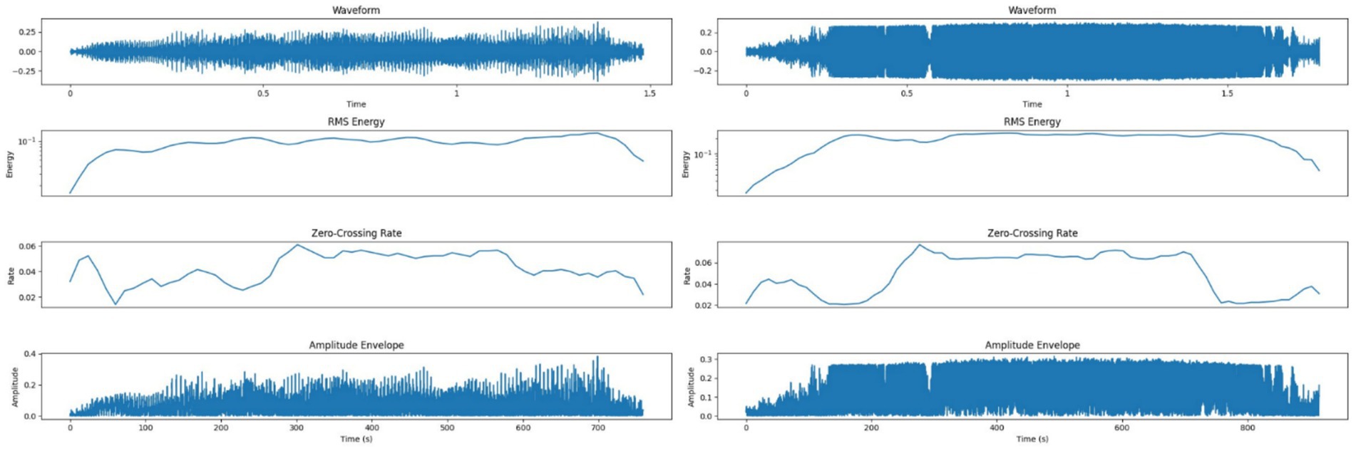 Two sets of sound wave analysis graphs. The first set includes a waveform, RMS energy, zero-crossing rate, and amplitude envelope, showing varying audio characteristics over time. The second set mirrors the first, illustrating similar data patterns with different time ranges.