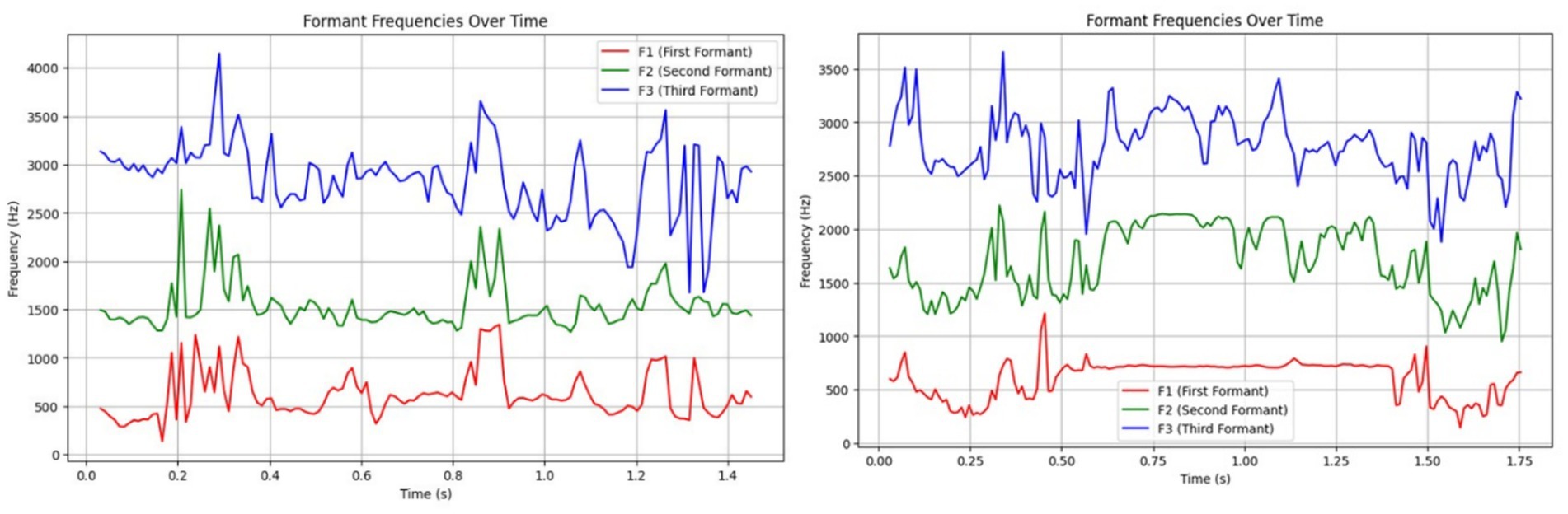 Two line graphs display formant frequencies over time. The left graph has the frequency in hertz on the y-axis ranging from zero to four thousand, and time in seconds on the x-axis ranging from zero to one point seven five. Three formants are shown: F1 in red, F2 in green, and F3 in blue. The patterns vary, with F3 generally highest and F1 lowest. Both graphs have similar axes and layout. A legend indicates the formant colors.