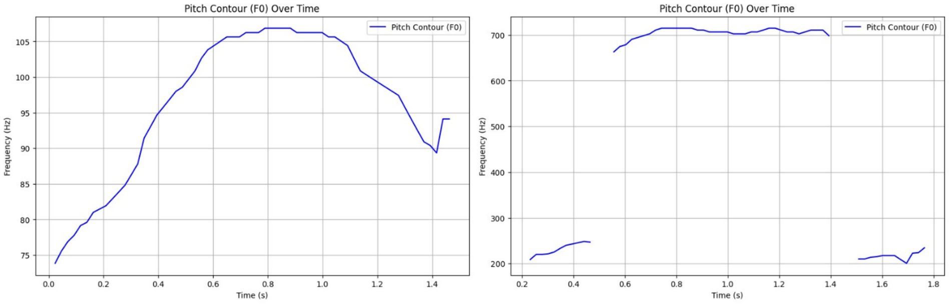 Figure 7. Left side – Prosodic pattern of a Low-Frequency Call (LFC), with a narrow F0 range and stable rhythm indicating calm, affiliative signaling; Right side – Prosodic pattern of a High-Frequency Call (HFC), with a broad F0 range and erratic modulation reflecting stress or agitation.
