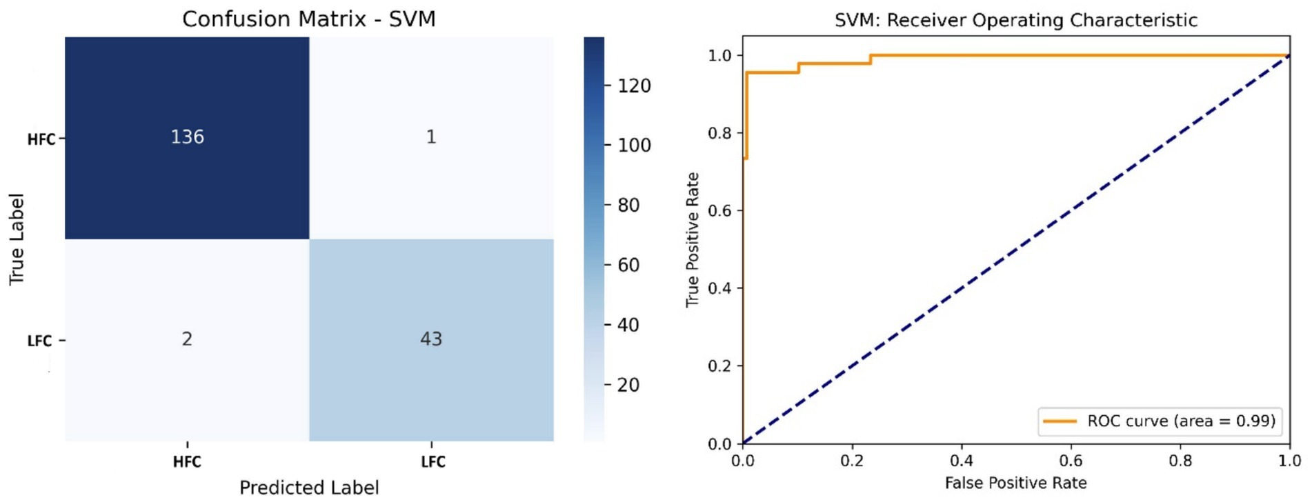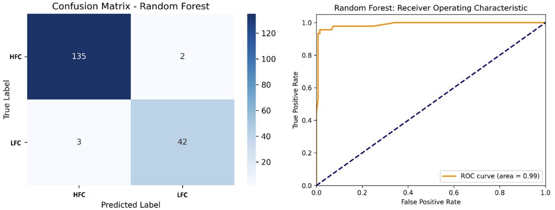 Figure 8. Left side – Confusion matrix of the Random Forest classifier, displaying classification accuracy of HFC and LFC calls; Right side – ROC curve of the Random Forest model, with a high AUC (0.99) confirming robust classifier performance.