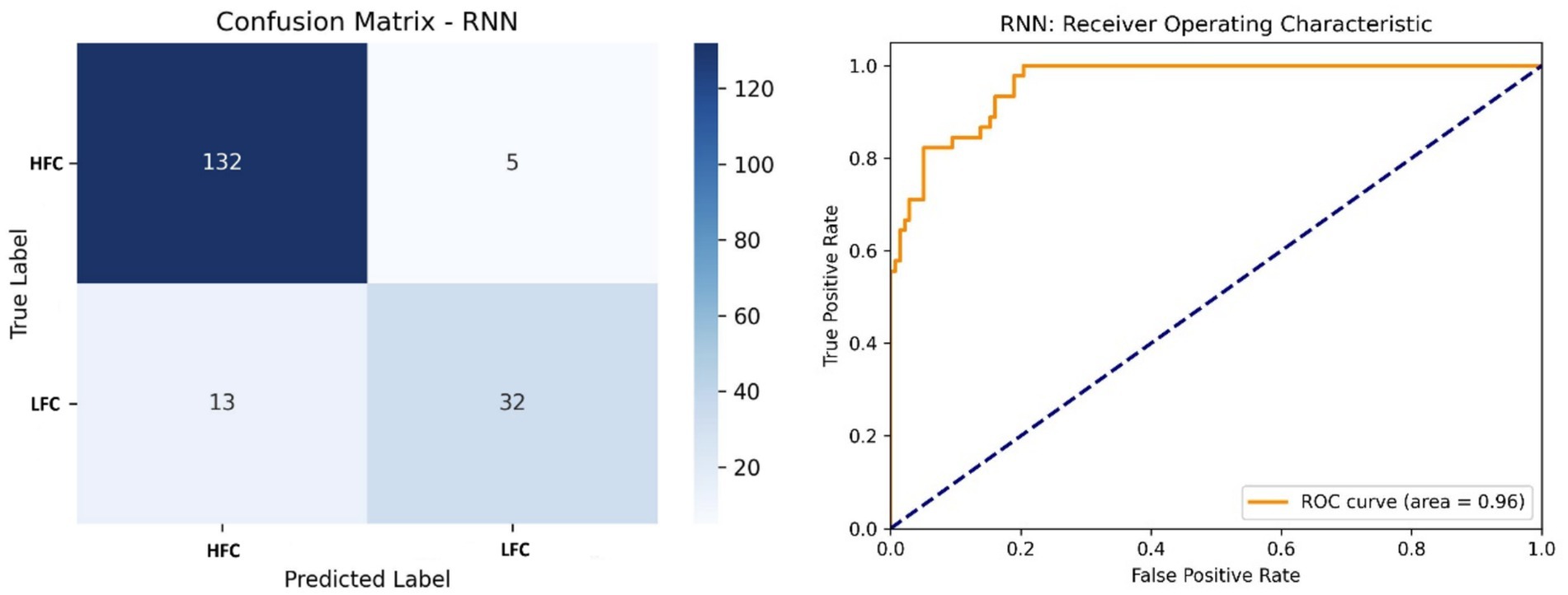 Confusion matrix and ROC curve for an RNN model. The confusion matrix shows true positive predictions for HFC at 132 and for LFC at 32, with misclassifications at 5 and 13 respectively. The ROC curve indicates a high model performance with an area under the curve of 0.96.