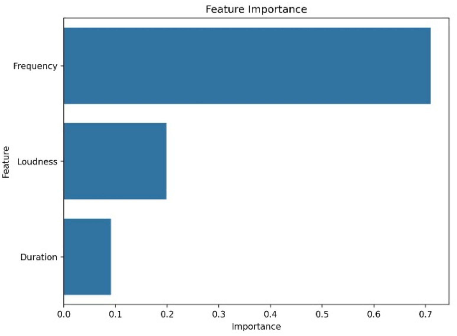 Figure 11. Feature importance in Random Forest model. Frequency, loudness, and duration rank as top predictors for vocalizations classification.