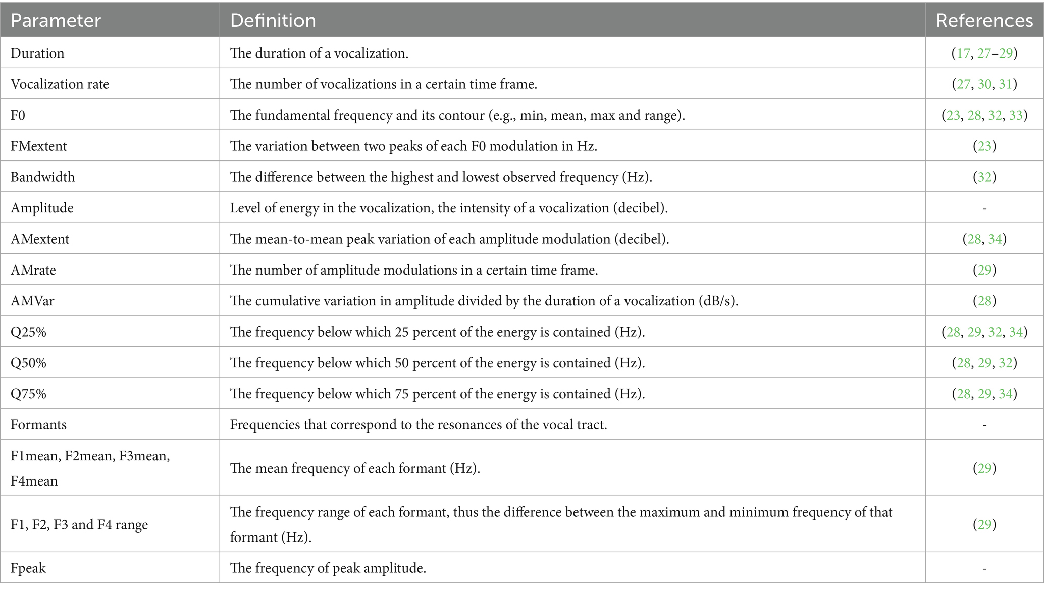 Table 1. Parameters extracted from the cows vocalizations.