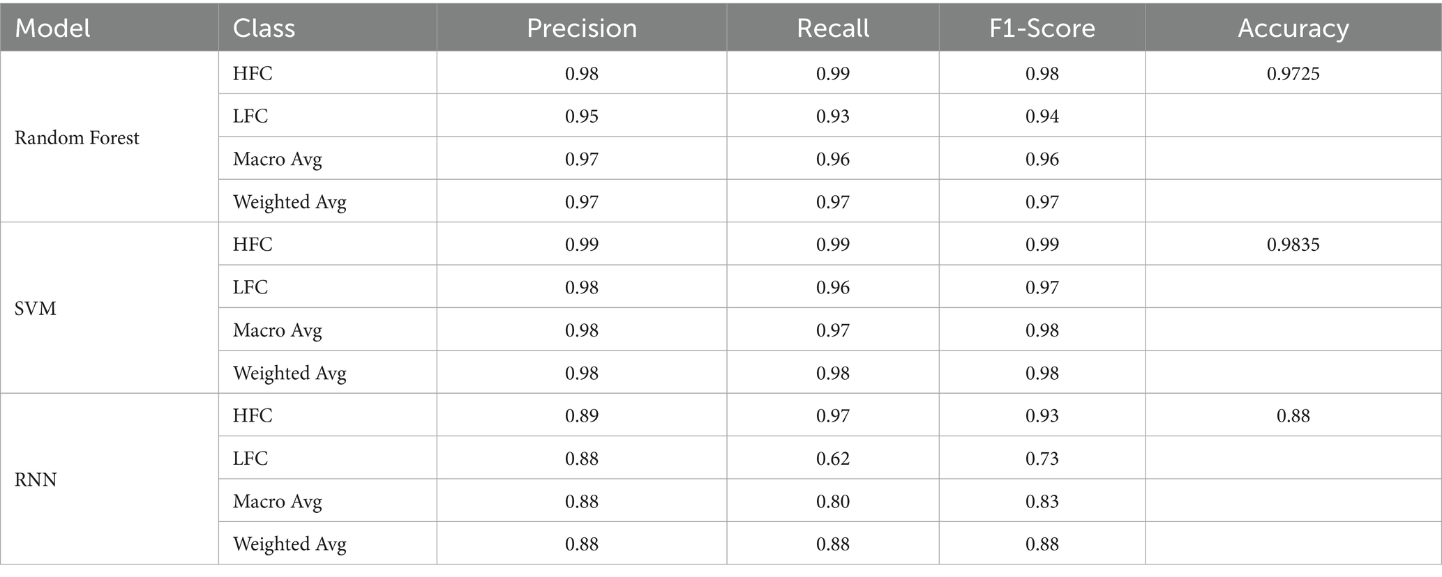 Table 2. Performance evaluation result of Random Forest, support vector machine and RNN.