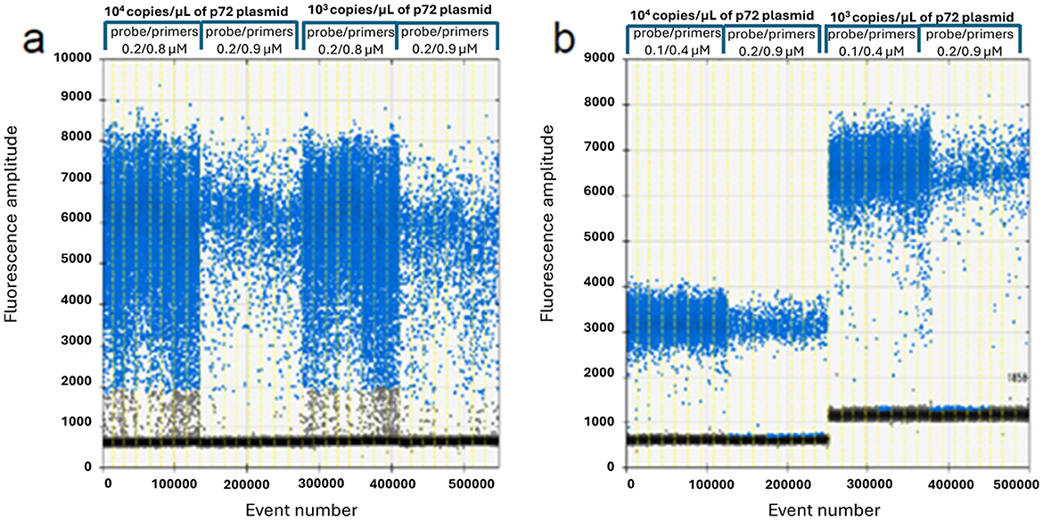 Figure 2. ddPCR primers and probe optimization on 104 and 103 copies/μl of p72 plasmid. P1 assay (a): 0.2/0.8 vs. 0.2/0.9 μM probe/primers concentration; P2 assay (b): 0.1/0.4 vs. 0.2/0.9 μM probe/primers concentration.