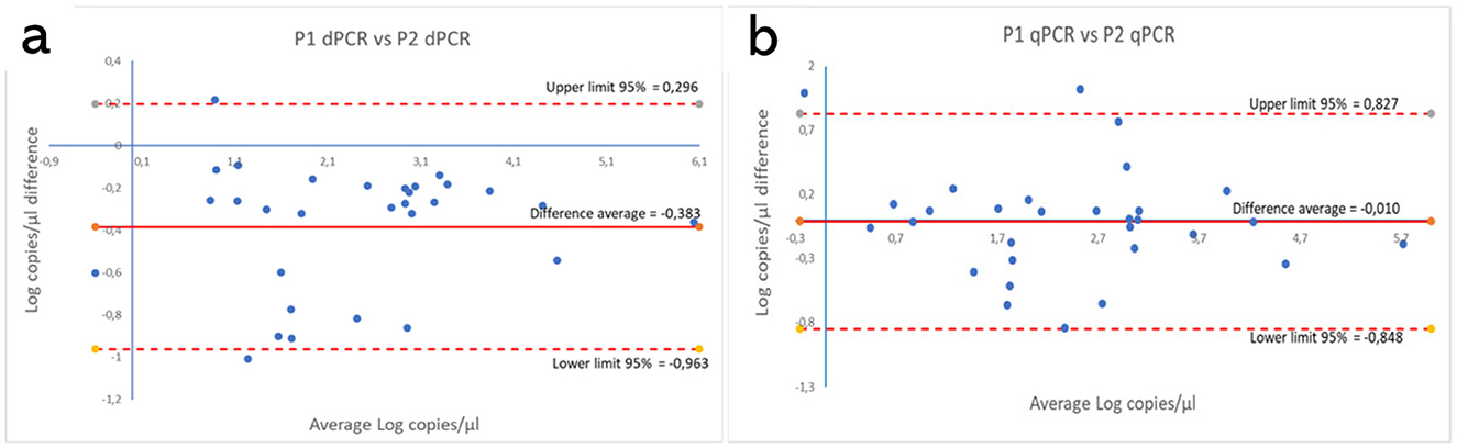 These results are shown in Supplementary Tables S3, S4. Figures 5, 6 show the comparison between the qPCRs and the ddPCRs assays using the Bland-Altman plot. The average difference (bias) between the P1 qPCR and the ddPCR was 0.201 log copies/μl (95% = −0.334; 0.736); the difference between the P2 qPCR and the ddPCR was −0.171 log copies/μl (95% = −0.731; 0.388). In contrast, the average difference (bias) between the two ddPCRs was −0.383 log copies/μl (95% = −0.963; 0.296), and the average difference (bias) between the two qPCRs was −0.010 log copies/μl (95% = −0.848; 0.827). By comparing the ddPCRs with the qPCRs, one point (Figure 5a, P1-ddPCR vs. qPCR = 3.33%) or a maximum of two points (Figure 5b, P2-ddPCR vs. qPCR = 6.67%; Figures 6a, b: P1-P2 ddPCR vs. qPCR = 6.66%) fell outside of the upper and lower limits.