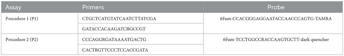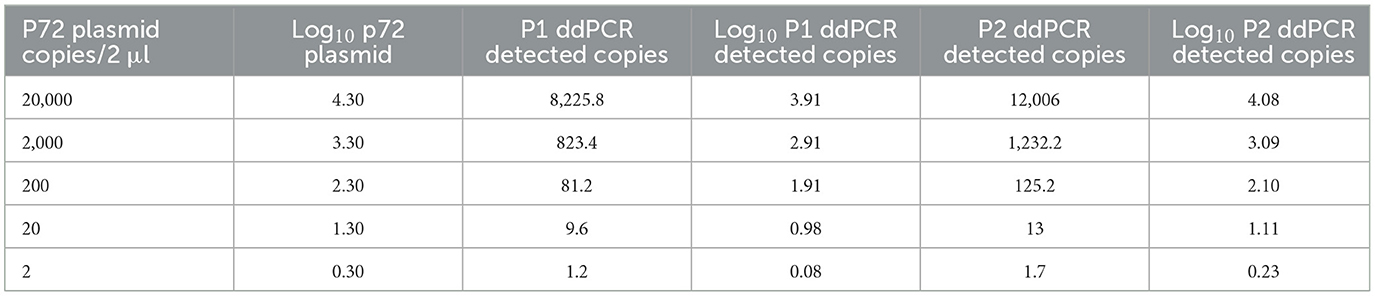 To the best of our knowledge, only a limited number of studies have been published so far, that have evaluated the analytical performances of the P1 (22, 26, 27) and the P2 (23). Whilst comparative studies between dPCR and qPCR are available for the P1 (26), a comparison of the results obtained for the P2 cannot be made. In fact, in the only validation study for the P2 qPCR available in the literature, conducted by Fernández-Pinero et al. (23), the probe used was different to the one used in our tests.