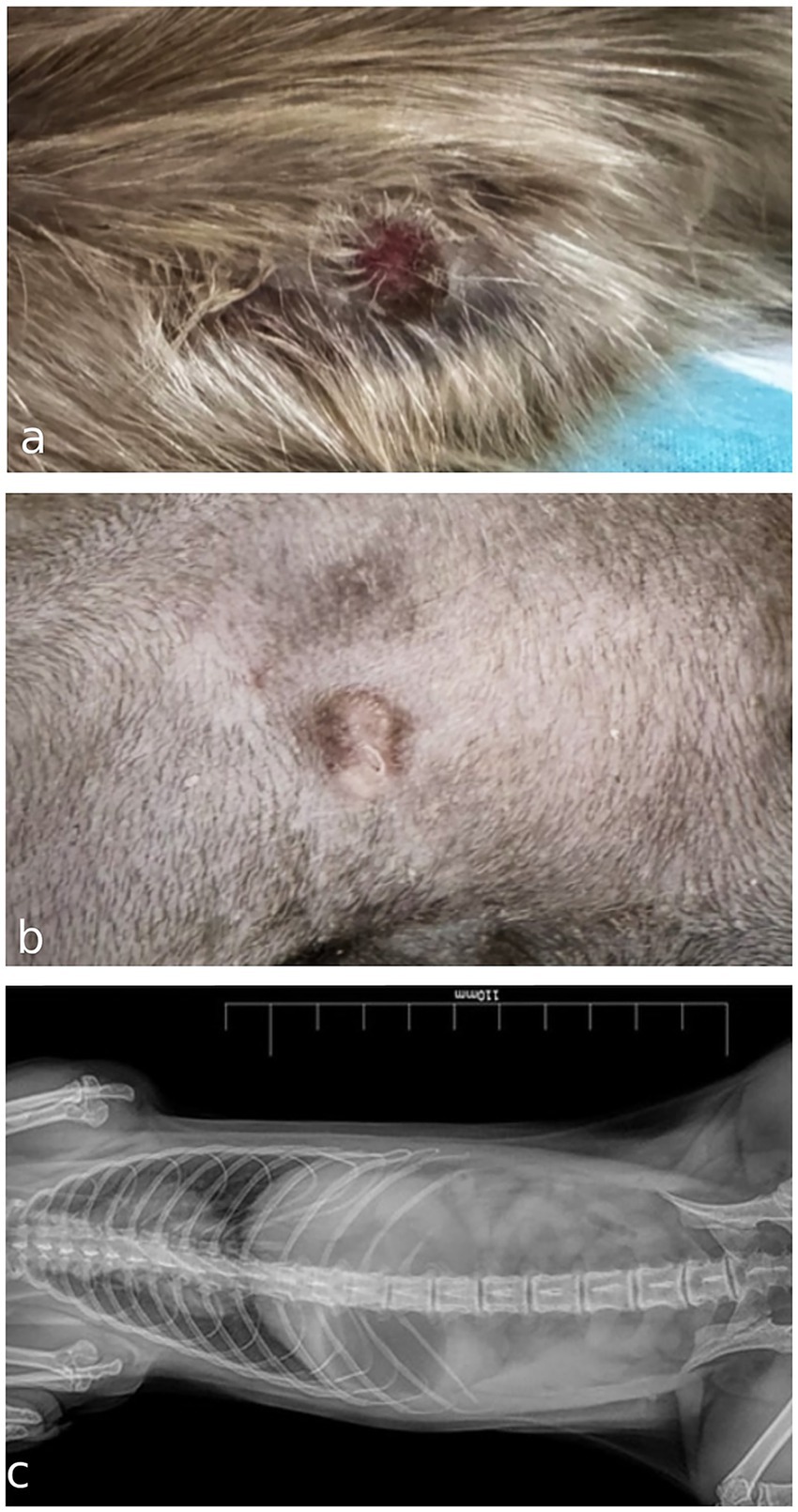 Figure 1. (a) Gross appearance of an ulcerated cutaneous mast cell tumor in the axillary region of a meerkat (Suricata suricatta) at first presentation. (b) Macroscopic appearance of the nodule after 2 weeks wearing a protective coat that reduces scratching and ulceration. (c) Ventrodorsal radiograph of thoracic and abdominal cavities in the absence of evident visceral lesions in a meerkat.