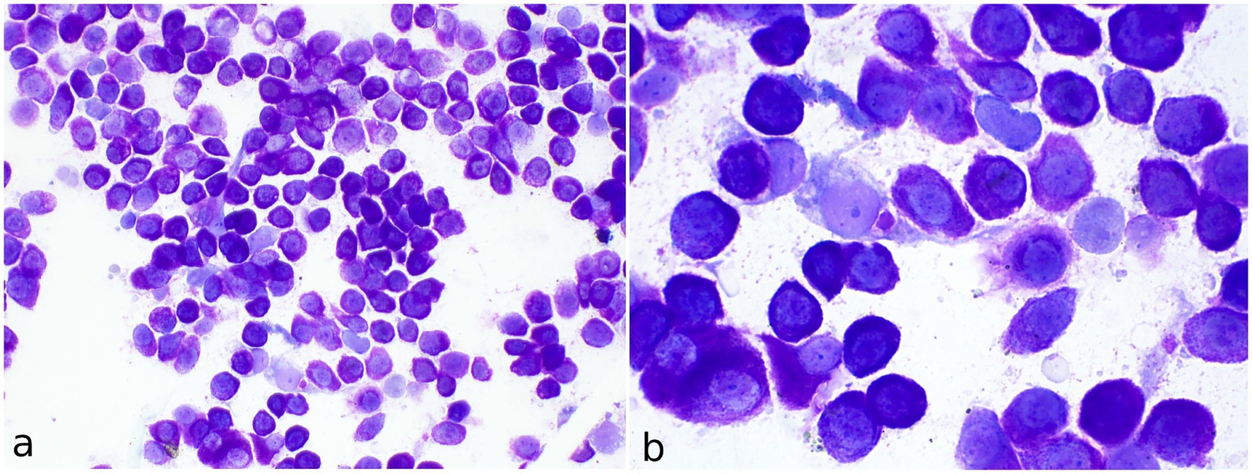 A total of four cytological preparations were examined, following staining with a rapid May-Grünwald Giemsa method (MGG quick stain—Bioptica Milano S.p.A). The samples displayed moderate cellularity, with abundant blood contamination and numerous naked nuclei observed in the background. The predominant cell population consisted of round cells with uniform morphology, present either singly or in small to medium aggregates (Figure 2a). These cells exhibited moderate amounts of cytoplasm containing fine, metachromatic granules in moderate to high quantities. The nuclei were round to oval, eccentrically positioned, with granular chromatin and occasionally visible nucleoli (Figure 2b). Mild to moderate anisocytosis, mild anisokaryosis, and occasional binucleation were noted. Rare neutrophilic and eosinophilic granulocytes, along with occasional mononuclear cells containing phagocytosed basophilic cellular debris, identified as macrophages, were also observed. The round cells were identified as mast cells. The findings were deemed consistent with a diagnosis of mast cell tumor. A mixed nonspecific inflammatory process was considered as a differential diagnosis.