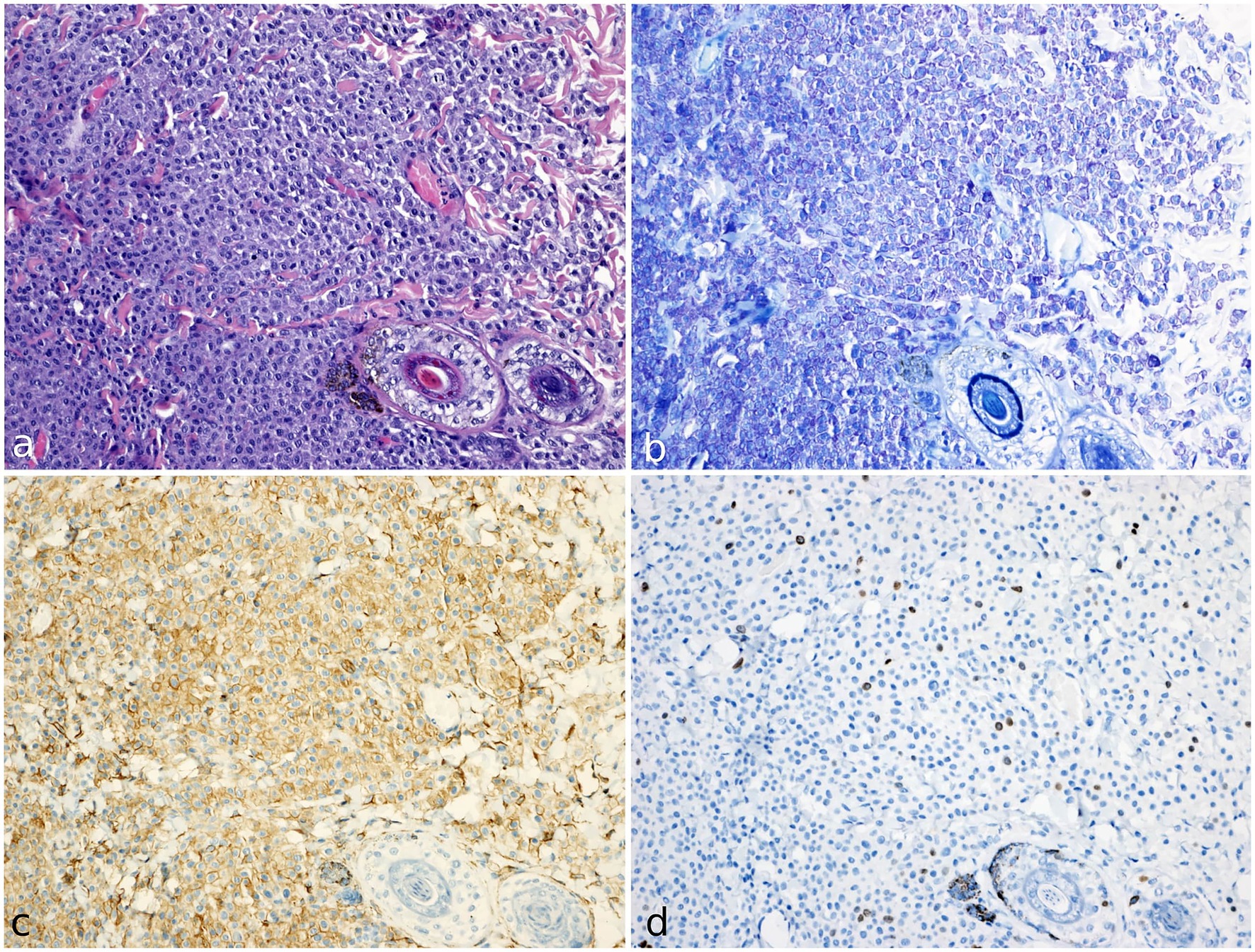 The sample was then fixed in 10% formalin-buffered solution and submitted for histopathological evaluation. Histologic examination revealed a densely cellular, non-encapsulated, poorly demarcated neoplasm infiltrating the dermis and the subcutis (Figure 3a). The tumor consisted of sheets of neoplastic round cells 20–24 μm in diameter, dissecting preexisting collagenous stroma. The neoplastic cells had well-defined margins, moderate amounts of amphophilic cytoplasm occasionally containing fine basophilic granules, a round central nucleus with coarsely stippled chromatin, and 1–2 visible nucleoli. Anisocytosis and anisokaryosis were moderate to marked; the mitotic count was 9 per 10 consecutive high-power fields (HPFs; 2.37 mm2), with atypical mitotic figures. The overlying epidermis showed mild orthokeratosis. The excisional margins were assessed by cross-sectional technique, revealing focal infiltration of one lateral margin.