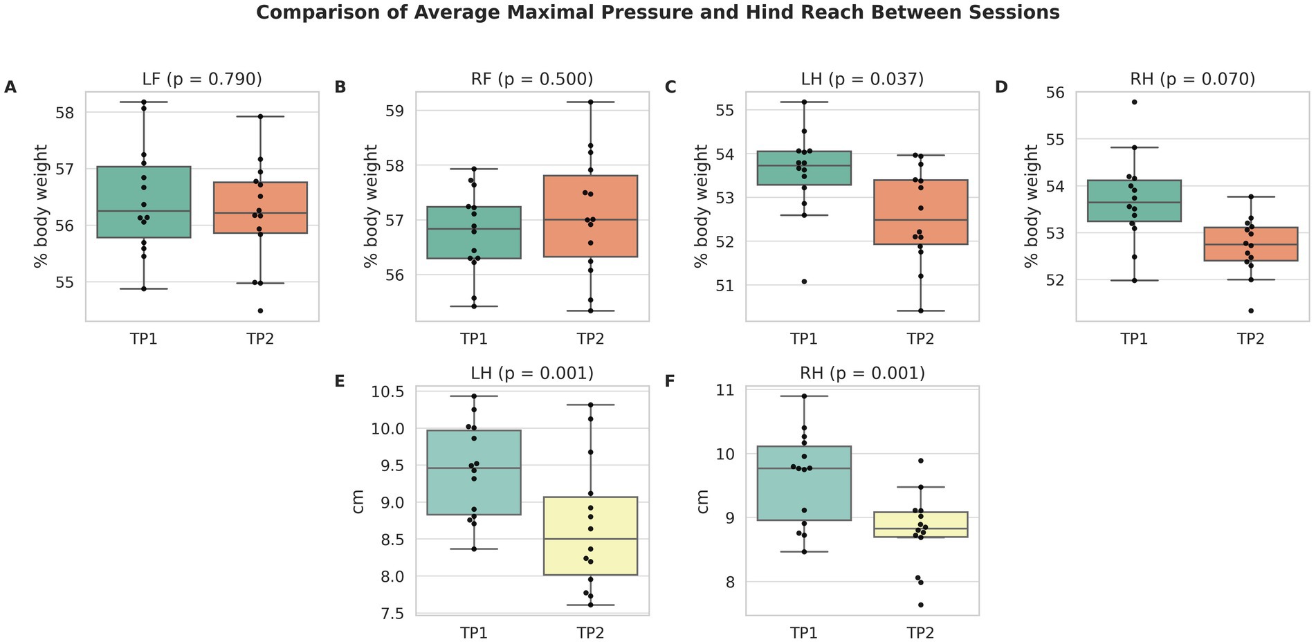 Figure 2. Comparison of average maximal pressure (A–D) and hind reach (E,F) between time point 1 (TP1) and 2 (TP2) for each limb. Boxplots show medians and interquartile ranges; black dots represent individual cats (n = 14 per session). p-values from mixed-effects models are shown above each pair. Only small differences were observed between time points, confirming high repeatability and intersession reliability.