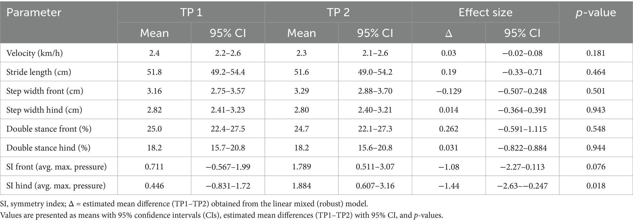 Repeatability was evaluated using linear mixed-effect regression. Because of repeated measures, generalized linear mixed-effects models with the individual animal as a random effect were applied. Model assumptions were systematically assessed: (1) the normality of residuals with the Shapiro–Wilk normality test, (2) the homogeneity of variances between groups with Bartlett’s test, and (3) the heteroscedasticity (constancy of error variance) with the Breusch–Pagan test. If assumptions were fulfilled, generalized linear mixed effects models (R package - lmer) were applied; if violated, robust linear mixed effects models were applied (R package - robustlmm). Model assumptions were not met for the stance phase, swing phase, double stance, symmetry index, hind reach, and velocity. Linear and robust linear models were compared using the conditional coefficient of determination R2, the marginal coefficient of determination R2, the intraclass-correlation coefficients (ICCs), and root mean square error (RMSE) as performance quality indicators. The model with the most favorable overall fitting power was retained. Contrasts between the categories (time points or limbs) were evaluated after model-fitting using estimated marginal means (R package - emmeans) with Tukey p-value correction for multiple comparisons. Results are presented as means with 95% confidence intervals (95% CI), unless otherwise indicated. In addition, intraclass correlation coefficients (ICCs) were calculated to assess intersession reliability, providing a complementary, widely recognized metric to confirm the findings and to convey reliability intuitively. Reliability was categorized as excellent (ICC > 0.9), good (0.75–0.9), moderate (0.5–0.75), and poor (< 0.5) (31). Statistical significance was defined as a p-value of < 0.05. Depending on the data distribution, descriptive results are reported as mean ± standard deviation (SD) or as median with interquartile range (IQR). All analyses were performed using R (version 4.5.0, 2025-04-11; R Foundation for Statistical Computing, Vienna, Austria) and IBM SPSS Statistics (version 28; IBM Corp., Armonk, NY, USA).