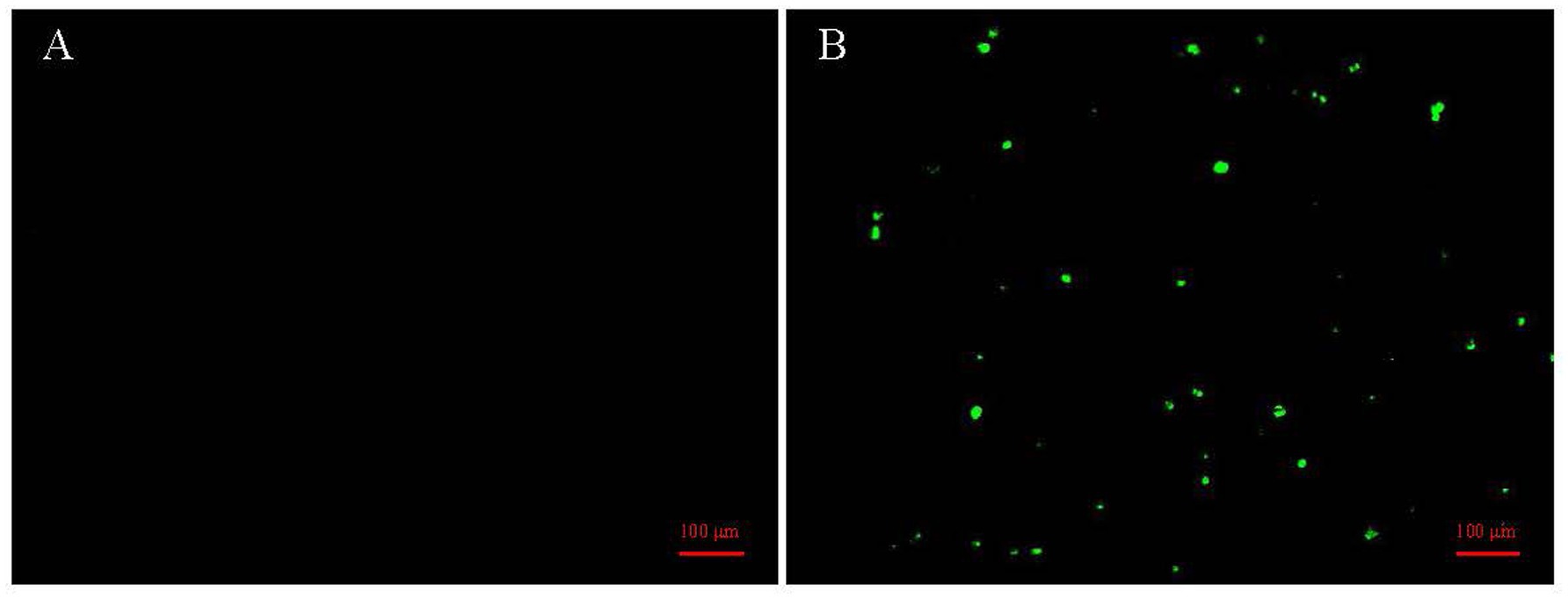 Figure 1. Detection of CIAV in MDCC-MSB1 cells by immunofluorescence assay (IFA). (A) Negative control MDCC-MSB1 cells inoculated with PBS, showing no specific fluorescence signals. (B) MDCC-MSB1 cells inoculated with the WSFL24 strain (MOI = 1) for 48 h, showing distinct cytoplasmic green fluorescence indicative of viral infection. Cells were stained with an anti-VP2 monoclonal antibody and detected with a FITC-conjugated secondary antibody.