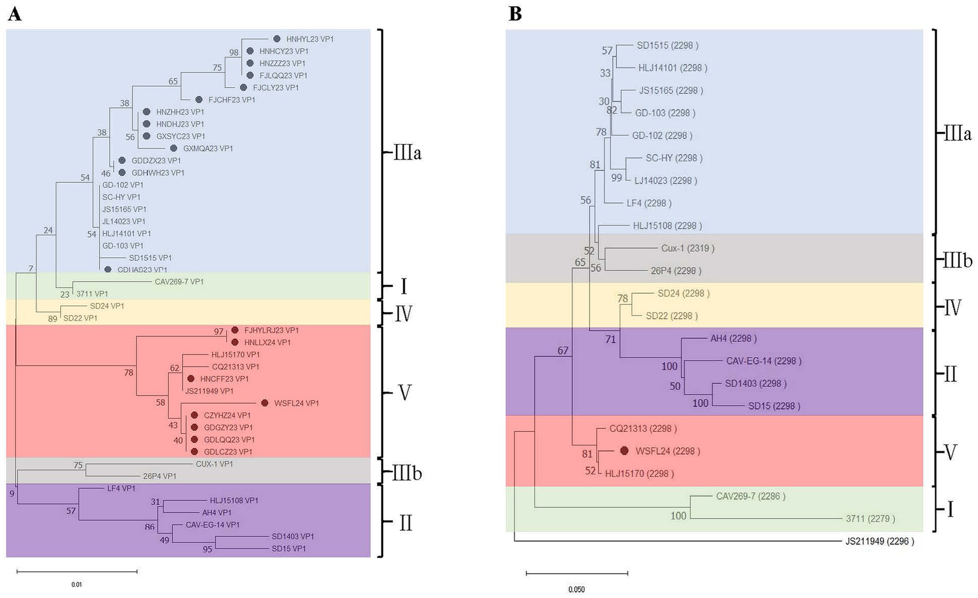Figure 2. Phylogenetic analysis of CIAV isolates from southern China (2023–2024). (A) Phylogenetic tree based on complete vp1 gene nucleotide sequences. (B) Genome-wide phylogenetic analysis of the representative WSFL24 strain (genotype V) compared with reference strains from different genotypes. Isolates obtained in this study are marked with solid circles.