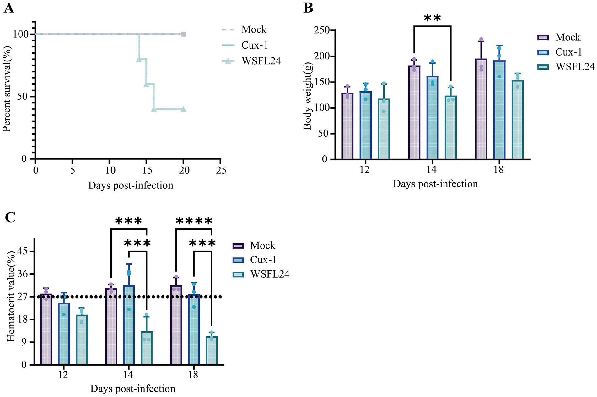 Figure 3. Pathogenicity assessment of the WSFL24 strain in SPF chicks. (A) Survival rates of chicks inoculated with WSFL24, Cux-1, or PBS (Mock) (n = 10 per group). (B) Body weight changes of chicks at 12, 14, and 18 dpi (n = 3 per group per time point). (C) Hematocrit (HCT) levels of chicks during the experimental period (n = 3 per group per time point). Data are expressed as means ± SD.
