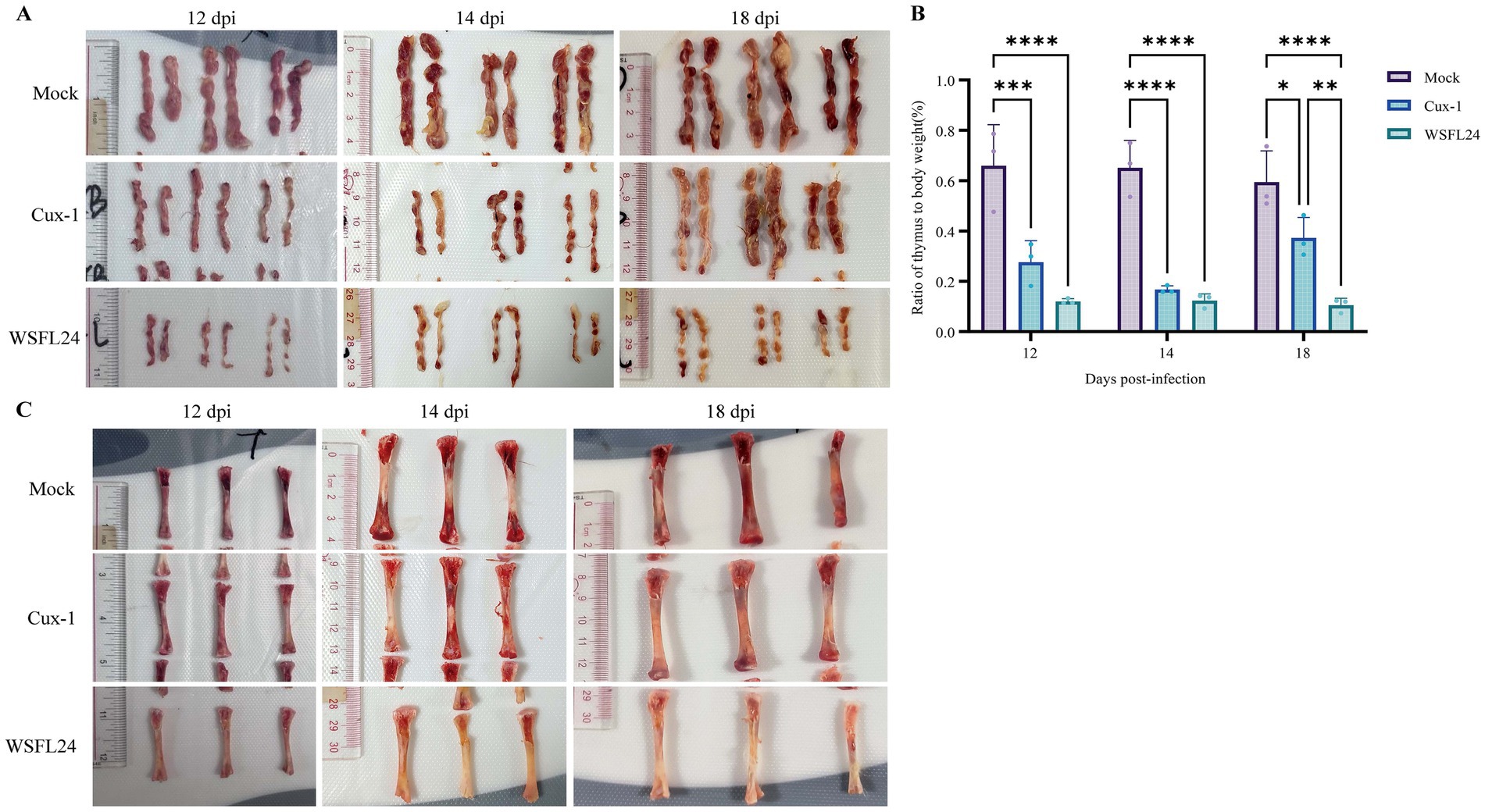 At necropsy, both Cux-1- and WSFL24-infected chickens exhibited thymic atrophy compared to controls (Figure 4A). Furthermore, the thymus index of WSFL24-infected chickens was significantly lower than that of Cux-1-infected group at 18 dpi (Figure 4B), indicating more pronounced thymic atrophy in WSFL24-infected chickens. Considerring the observed clicical signs of anemia and reduced HCT, we performed gross examination of bone marrow at 12, 14, and 18 dpi. Notably, WSFL24-infected chickens exhibited progressive bone marrow yellowing compared to controls (Figure 4C), consistent with impaired erythropoiesis and advanced anemia. These findings collectively demonstrate the heightened virulence of the WSFL24 strain.