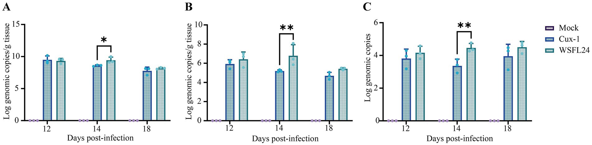 To further assess viral replication kinetics and tissue distribution, quantitative viral loads were determined in the thymus, bursa of Fabricius, and cloacal swabs at 12, 14, and 18 days post-infection (dpi). At 14 dpi, viral loads in both thymus and bursal tissues were markedly higher in the WSFL24-infected group than in the Cux-1-infected group. Specifically, thymic viral loads reached 9.42 ± 0.49 log10 copies/g in WSFL24-infected chickens, compared with 8.59 ± 0.11 log10 copies/g in Cux-1-infected chickens (p < 0.01) (Figure 5A). Similarly, bursal viral loads were significantly higher in the WSFL24 group (6.78 ± 1.16 log10 copies/g) than in the Cux-1 group (5.19 ± 0.12 log10 copies/g, p < 0.01) (Figure 5B). Consistently, viral shedding detected in cloacal swabs was also significantly greater in the WSFL24 group (4.46 ± 0.27 log10 copies) compared with the Cux-1 group (3.36 ± 0.41 log10 copies, p < 0.05) at 14 dpi (Figure 5C). Collectively, these quantitative results demonstrate that the WSFL24 strain exhibits enhanced replication capacity and broader tissue dissemination compared with the classical Cux-1 strain.