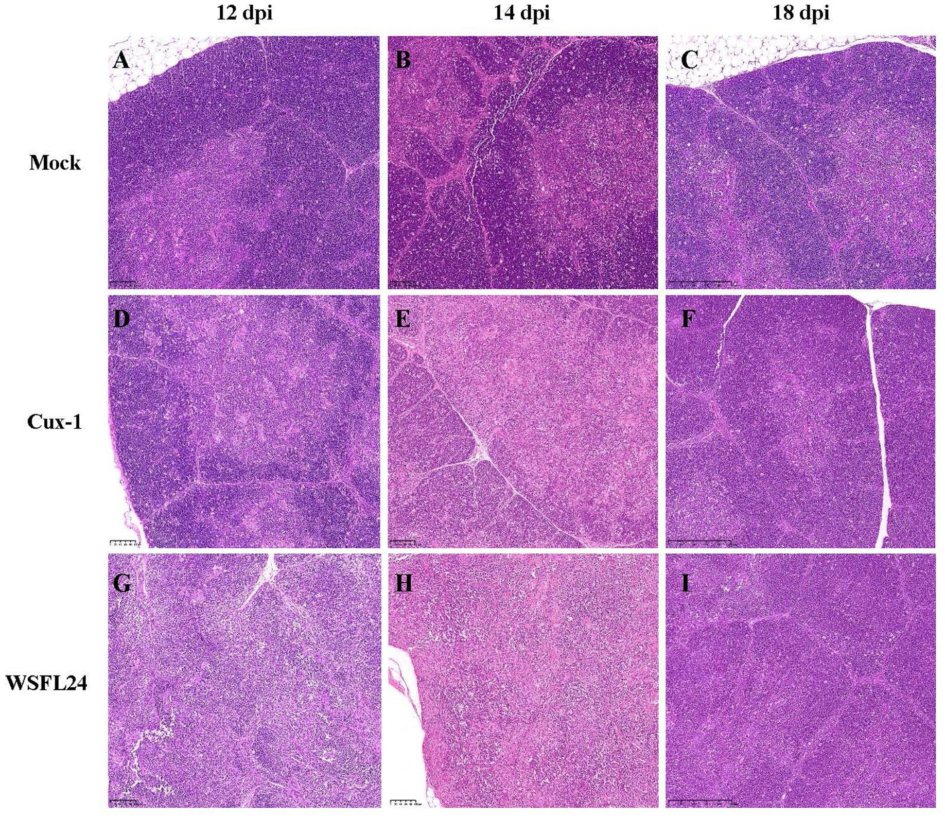 Figure 6. Histopathological changes in thymus tissues of CIAV-infected chicks. (A–C) Mock-infected group at 12, 14, and 18 dpi, showing normal corticomedullary structure. (D–F) Cux-1-infected group at 12, 14, and 18 dpi, showing mild cortical disorganization. (G–I) WSFL24-infected group at 12, 14, and 18 dpi, showing severe cortical disorganization and loss of corticomedullary junction integrity.
