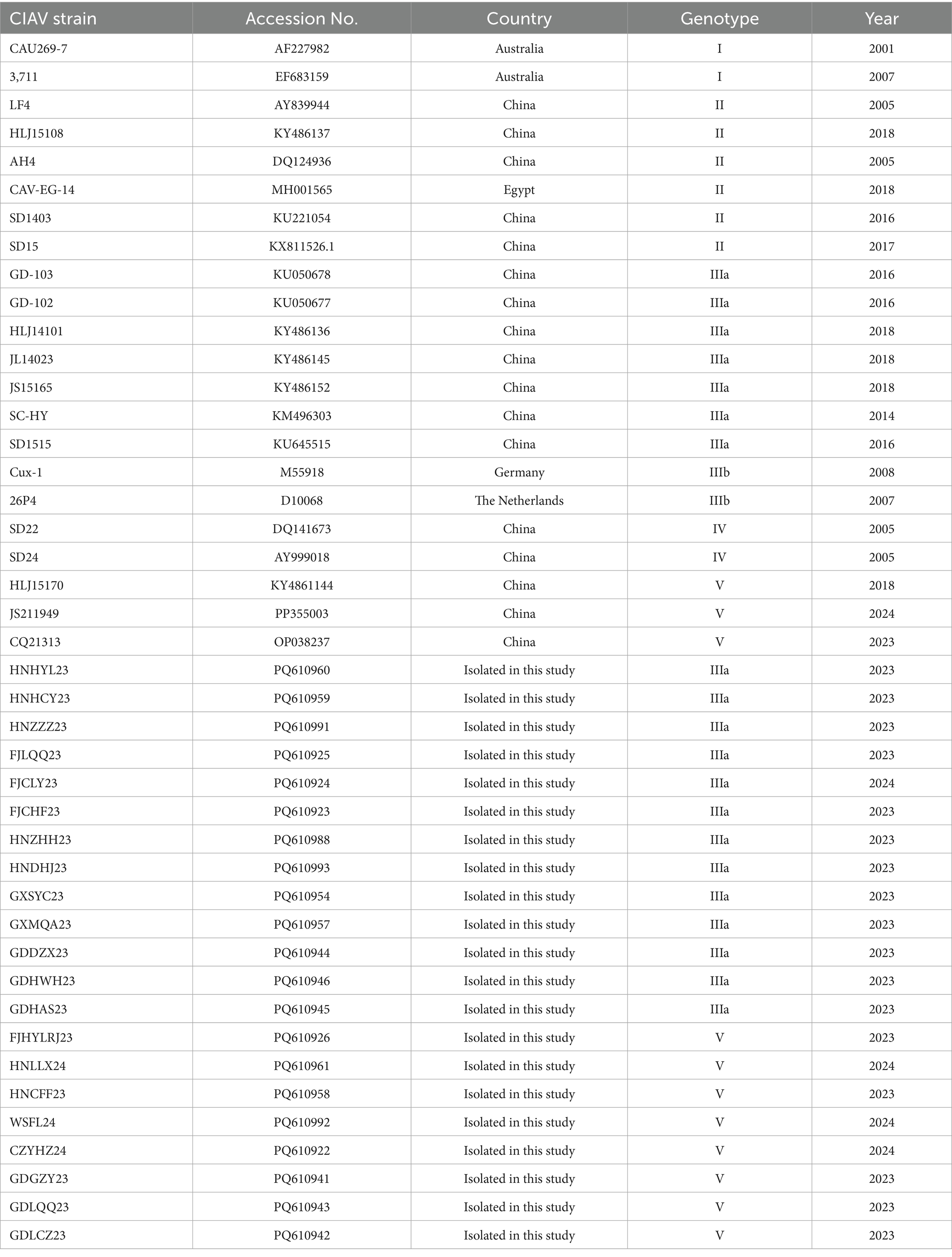 Discussion: These results demonstrate the emergence and enhanced virulence of genotype V CIAV strains in southern China. The findings emphasize the need for continuous molecular surveillance and the development of updated vaccines to control evolving virulent genotypes.