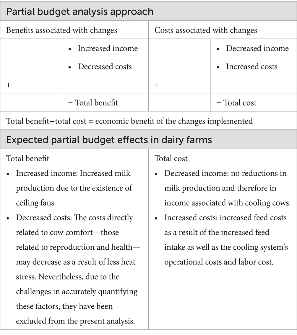 There are some drawbacks to partial budget analysis. Some cost or income factors can be overlooked, which may pose a problem. Therefore, it is necessary to expand the scope of the analysis and include missing cost factors. These factors can affect the overall cost structure of the farm and may play an important role in farmers’ decision-making process (59). The partial budget’s inability to display the full breakeven point for dairy farms is also another important issue. In some situations, the farmer wants to know how a particular decision will affect the bottom line. For example, the breakeven milk price is only marginally helpful to farmers; in these situations, the total breakeven point would probably have greater importance. Therefore, it is recommended that further studies conduct a more comprehensive economic analysis under different scenarios by expanding the scope of the data.