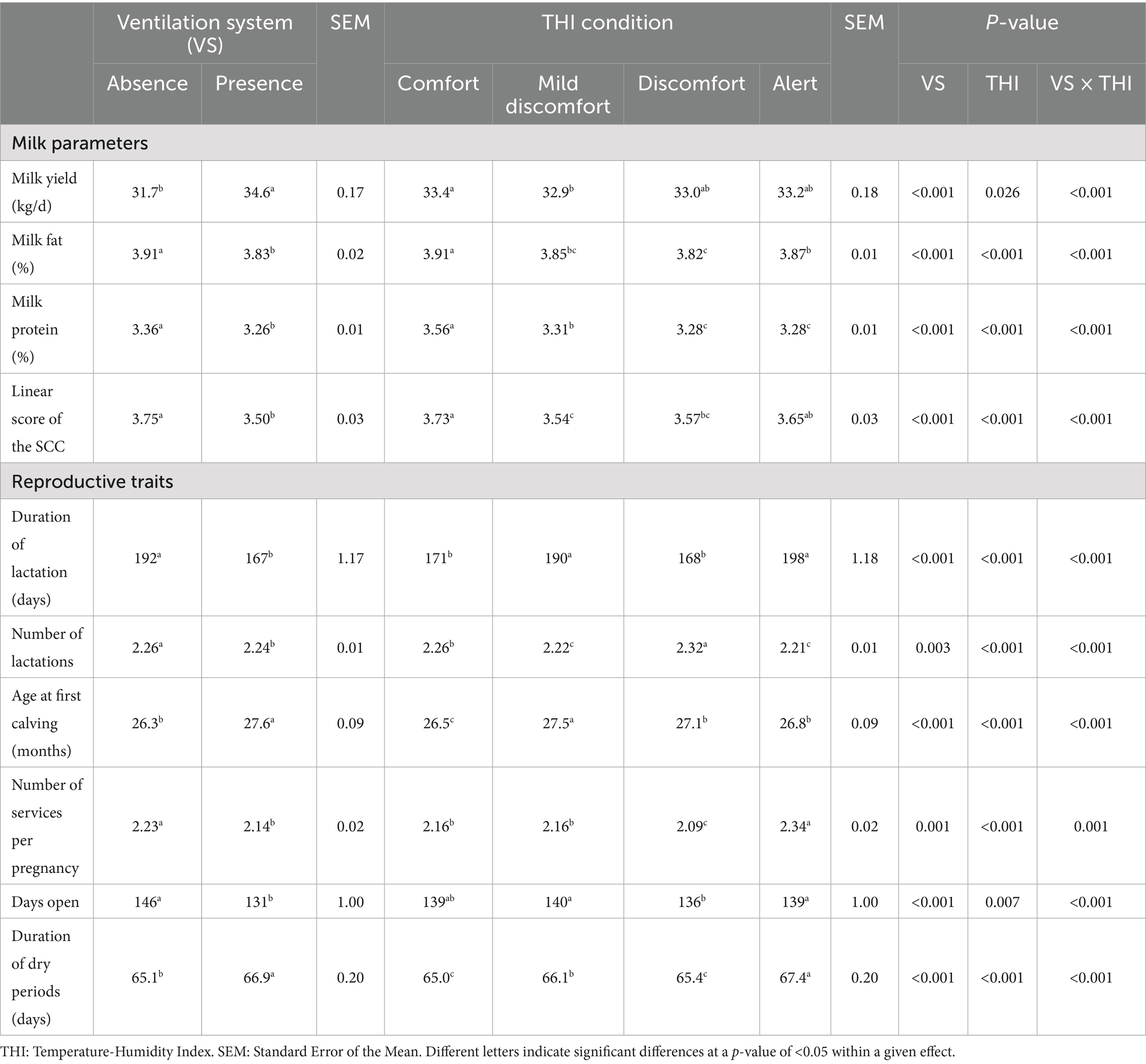 Table 4. Effects of ventilation systems, THI conditions, and their interaction on milk yield and quality, as well as on cow reproductive parameters, in the four dairy herds reared in Northern Italy.