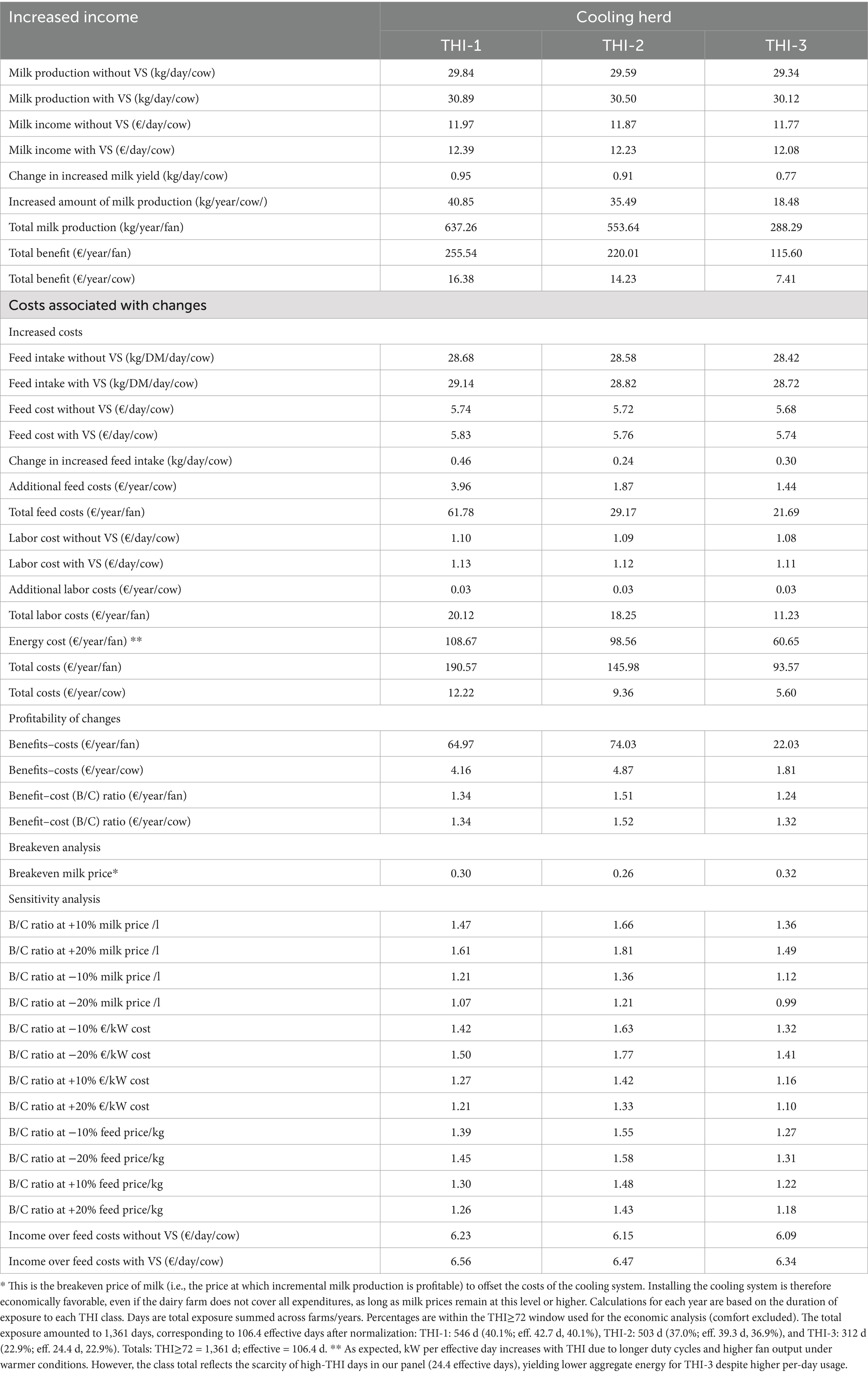 The breakeven price of milk is the price at which incremental milk production is profitable and offsets the costs of the cooling system (24). In our study, the milk price was 0.401 €/kg and was compared to the breakeven price at different THI levels. With a breakeven price of 0.30€/kg at THI-1, the current milk price is sufficient to cover costs and generate a profit, highlighting favorable conditions for milk production. Similarly, at THI-2, the breakeven price further declined to 0.26 €/kg, reinforcing the economic advantage of the ventilation system even under discomfort conditions. However, at THI-3, the breakeven price increased to 0.32 €/kg, narrowing the profit margin as thermal stress intensifies. Nonetheless, since the current milk price (0.401 €/kg) still remains above this threshold, the system continues to ensure profitability even during periods of severe heat stress.