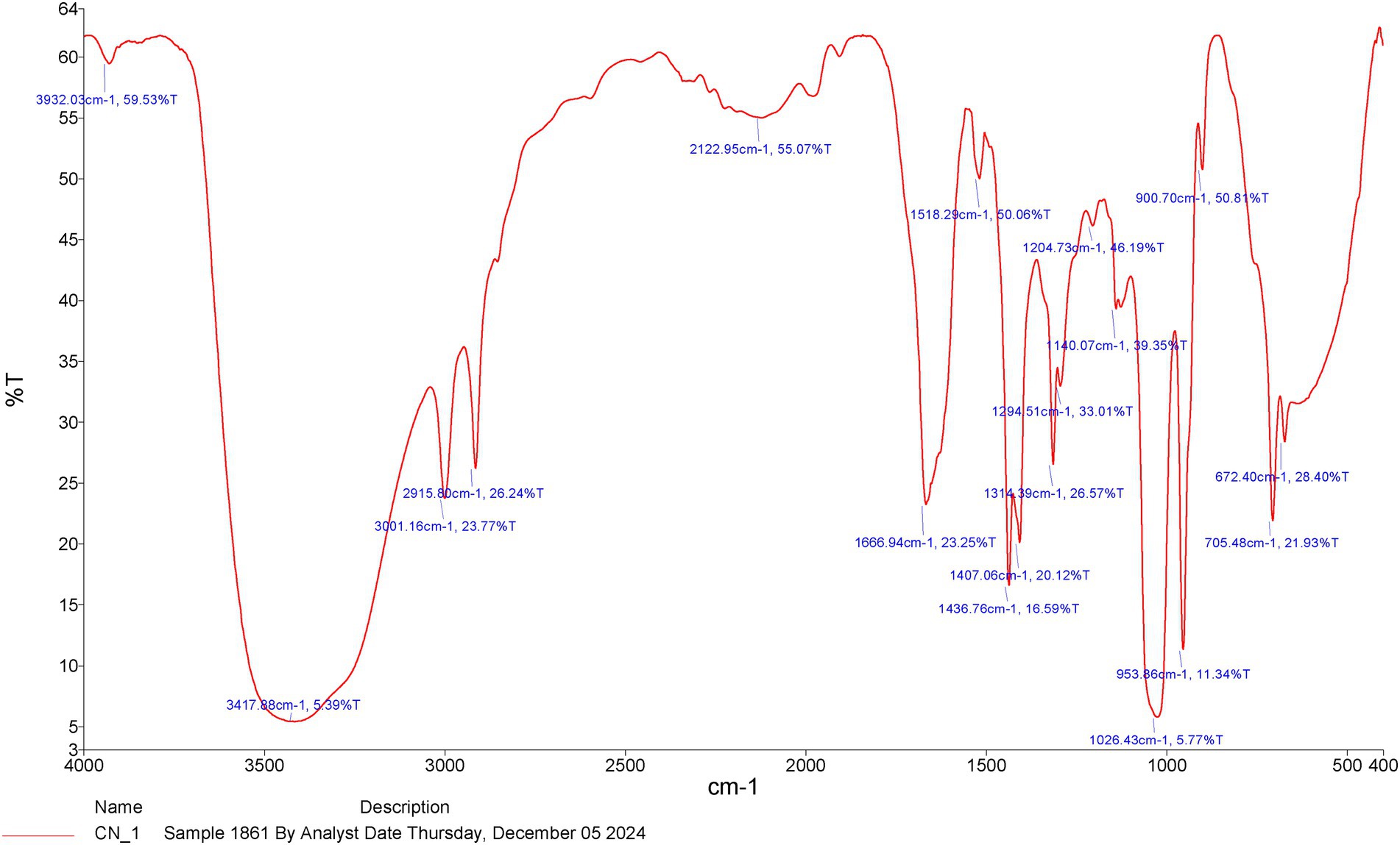 Chemical analysis was performed via Fourier transform infrared spectroscopy (FTIR), and the results revealed that the ethanolic CNBV included 18 chemical compounds, with major absorption bands between 3932.03 cm − 1 and 672.40 cm − 1 (Figure 1). The analysis revealed the following active phytochemical components: O-H stretching, N-H stretching, O-H stretching, N-H stretching, N=N=N stretching, C=O stretching, N-O stretching, C-H bending, O-H bending, O-H bending, C-O stretching, C-O stretching, C-O stretching, C-O stretching, and C=C bending, with an absorbance of 400–4,000/cm − 1 (Table 1).