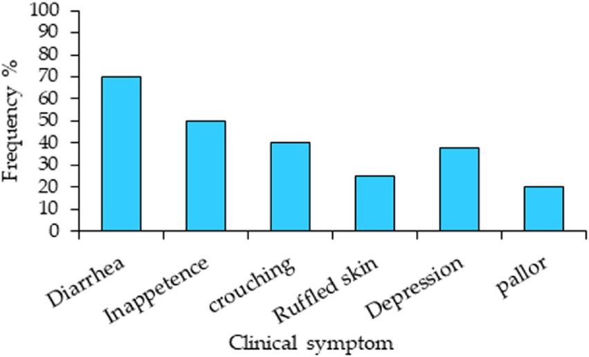 Figure 2 illustrates the frequency of clinical symptoms observed in the mice. The clinical indications varied in intensity among the experimental mice. The most prevalent sign was diarrhea. Infected mice clearly displayed coccidiosis symptoms, such as crouching, inappetence, sadness, and ruffled skin, whereas uninfected or amprolium-treated mice did not.