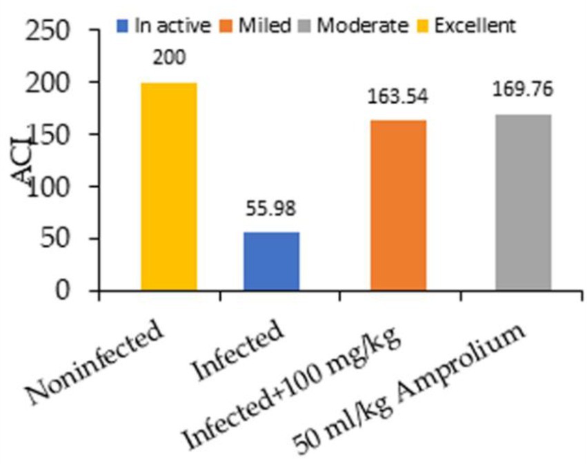 Figure 3 shows the impact of the experimental groups on the anticoccidian index (ACI) of each group five days post dosage. We administered 100 mg/kg CNB and 50 mg/kg amprolium to both the infected groups. ACI scores ranging from 120–140, 140–160, 160–180, or over 180 were categorized as mild, moderate, marked, or outstanding, respectively.