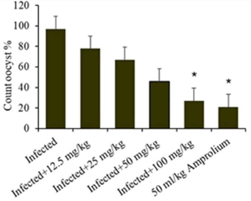 Figure 5. Illustrates the effect ratio of the experimental Cinnamomum verum bark extract sporulation oocyst count in 1 g of feces from infected, treatment (CVBE), and amprolium-treated mice. * The difference between the infected treated groups was significant at p ≤ 0.05.