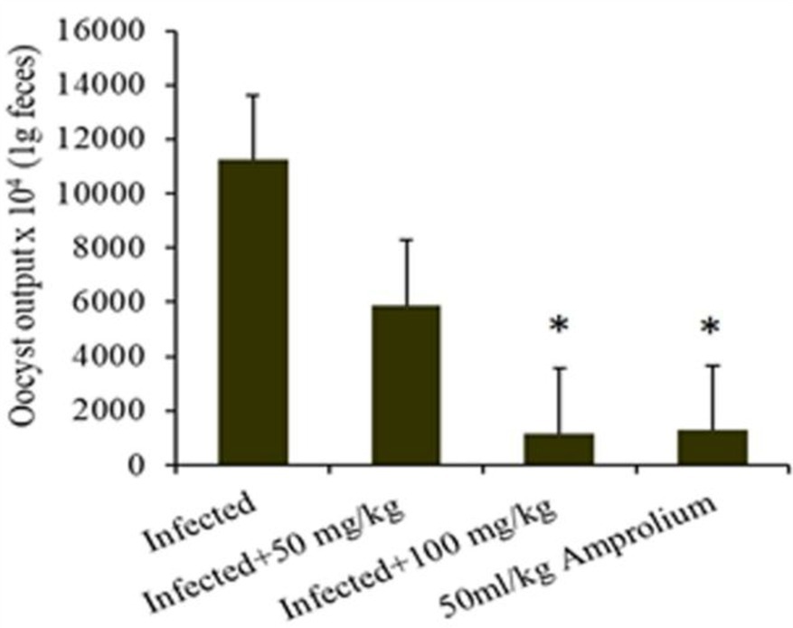 Figure 4. Shows the effect ratio of experimental Cinnamomum verum bark extracts on oocyst production on the fifth day following Eimeria papillata oocyst infection. Significance is relative to the infected cohort (p < 0.05).