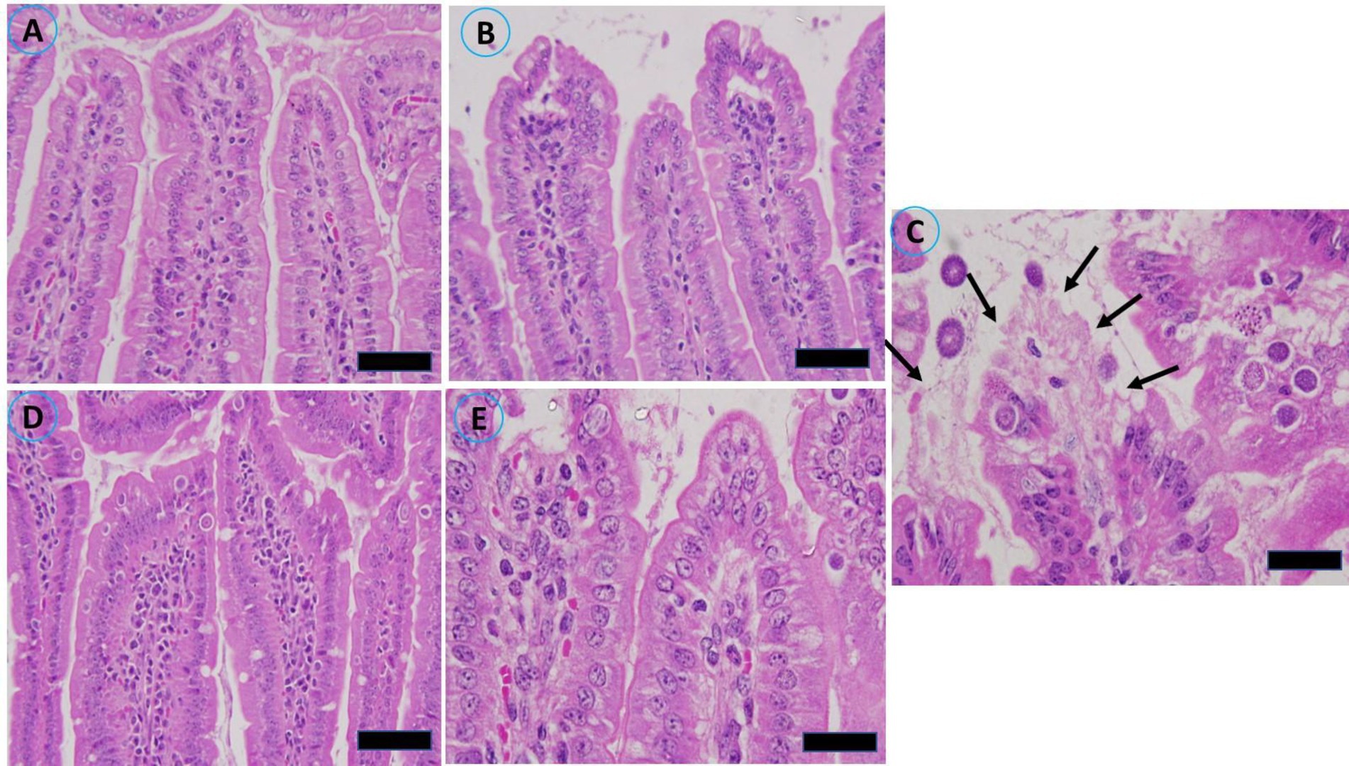 Figure 6. Histopathological alterations in the jejunal sections of mice resulting from infection with sporulated oocysts of Eimeria papillata, stained with Masson’s trichrome on day 5 post infection. (A) Noninfected (−CVBE); (B) Noninfected (+CVBE); (C) infected (−CVBE) denoted by arrows; (D) infected+100 mg/mL CVBE; (E) infected + amproluim 50 mg/mL. Scale Bar 20 μm.