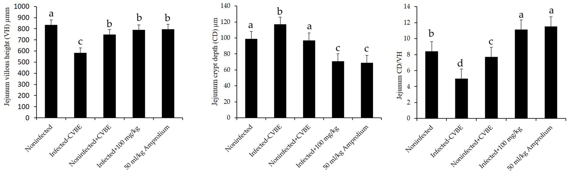 Figure 7 shows that jejunal villous height (VH) was significantly lower in the infected group than in the noninfected group, crypt depth (CD) significantly affect. Anticoccidial treatments with 100 mg/mL of CVBE and 50 mg/mL Amprolium enhanced jejunal architecture in challenged mice; the villus height was greater in these groups than in the infected group, whereas the crypt depth was lower, and the VH-to-crypt depth ratio was greater in the CVBE and amprolium groups than in the other groups (Figure 7).