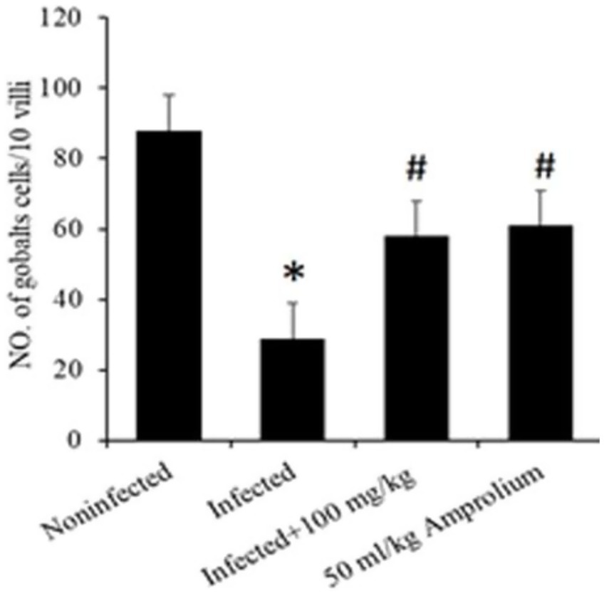 Figure 8. Impact of Cinnamomum verum bark extracts on the decrease in the goblet cell population in the jejunum of Eimeria papillata-infected mice. All values are shown as the means ± standard errors. Significant divergence from the control group (p ≤ 0.05) is indicated by *, #.