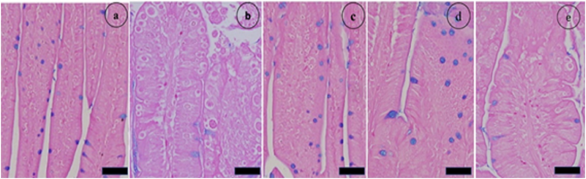 Figure 9. The impact of Cinnamomum verum bark extracts on the number of goblet cells in the jejunum of mice infected with Eimeria papillata. (a) denotes the noninfected group; (b) signifies the nontreated group exhibiting developmental stages; (c) indicates the noninfected group receiving Cinnamomum verum bark extracts only; (d) represents the treated group administered 100 mg/kg Cinnamomum verum bark extracts; and (e) refers to the infected group that received amprolium therapy. Alcian blue was used to stain the pieces. The scale bar represents 20 μm.