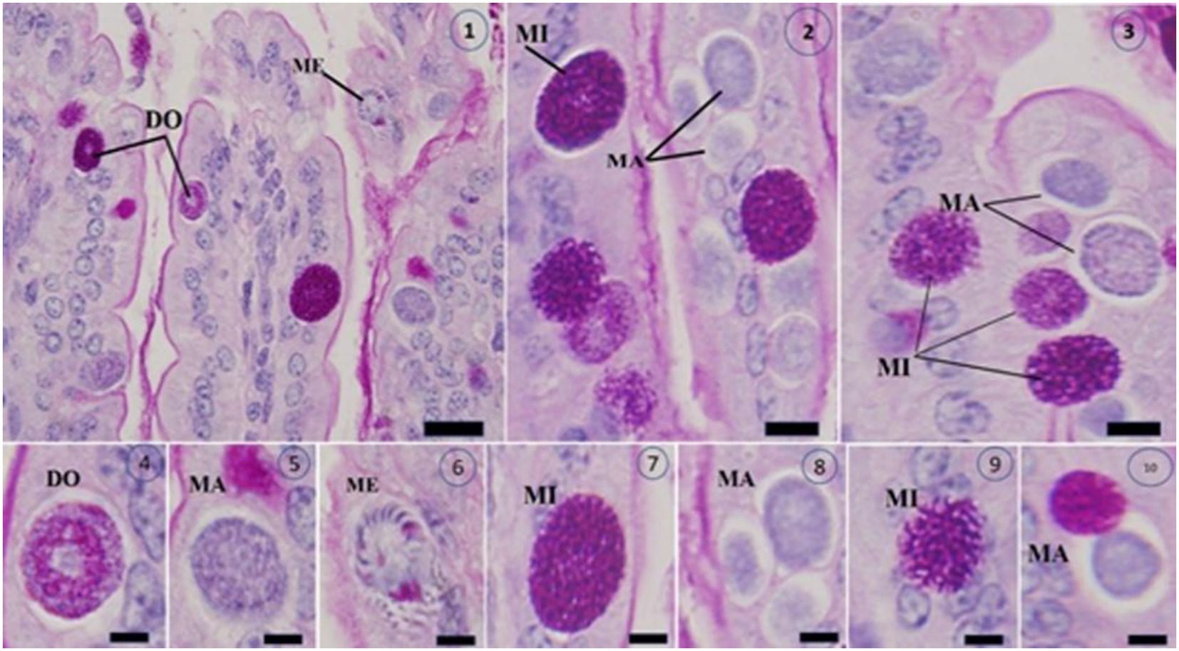 Figure 10. Shows Masson’s trichrome-stained slices of the jejunum infected with Eimeria papillata on day 5 after infection, revealing several developmental stages (1–10). The image displays a Meront (ME), macrogamont (MA), microgamont (MI), and developing oocyst (DO). Scale bar = 20 μm.