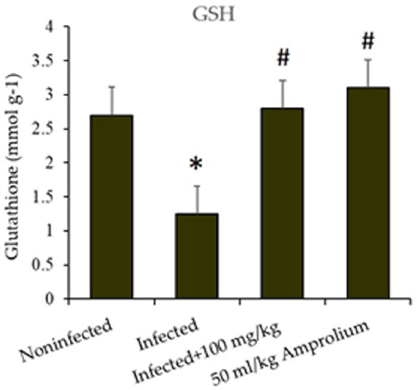 Figure 11. Impact of Cinnamomum verum bark extracts on jejunal glutathione levels in mice infected with Eimeria papillata. * and # indicate statistically significant differences between the control and infected groups, respectively, at p < 0.01.