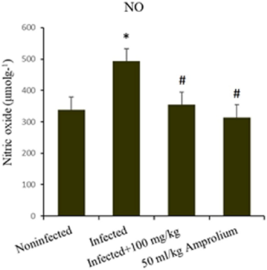 Figure 12. Impact of Cinnamomum verum bark extracts on jejunal nitric oxide levels in mice infected with Eimeria papillata. * and # indicate statistical significance in relation to the infected group at p < 0.01.