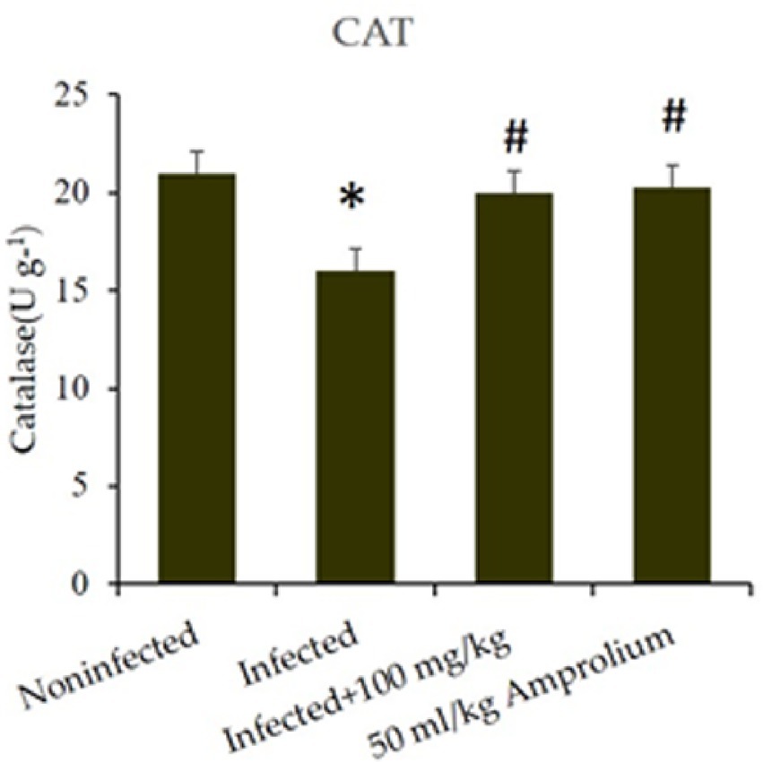 Figure 13. Impact of Cinnamomum verum bark extracts on jejunal catalase levels in mice infected with Eimeria papillata. * and # indicate statistical significance in relation to the infected group at p < 0.01.