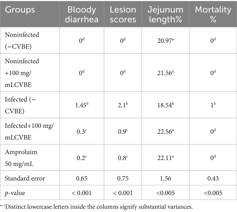 The anticoccidial index (ACI) was used to evaluate the preventive efficiency of CNBE against coccidia. Anticoccidial characteristics, including bloody diarrhea, oocyst value (OV), relative weight gain (RWG), lesion value (LV), and survival rate (SR), were assessed to compute the anticoccidial index (ACI) via the method of Habibi et al. (19).